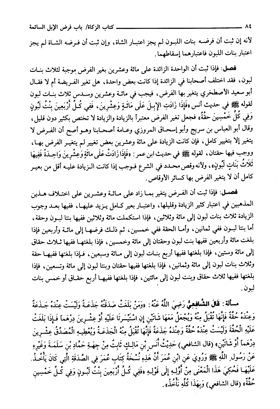 : فَإِذَا ثَبَتَ أَنَّ الْفَرْضَ يَتَغَيَّرُ بِمَا زَادَ عَلَى مِائَةٍ وَعِشْرِينَ عَلَى اخْتِلَافِ هَذَيْنِ الْمَذْهَبَيْنِ فِي اعْتِبَارِ كَثِيرِ الزِّيَادَةِ وَقَلِيلِهَا، وَاعْتِبَارِ بَعِيرٍ كَامِلٍ يَزِيدُ عَلَيْهَا، فَفِيهَا بَعْدَ وُجُوبِ الزِّيَادَةِ ثَلَاثُ بَنَاتِ لَبُونٍ إِلَى مِائَةٍ وَثَلَاثِينَ، فَإِذَا اسْتَكْمَلَتْ مِائَةً وَثَلَاثِينَ فَفِيهَا بِنْتَا لَبُونٍ وَحِقَّةٌ، أَمَّا بِنْتَا لَبُونٍ فَفِي ثَمَانِينَ، وَأَمَّا الْحِقَّةُ فَفِي خَمْسِينَ، ثُمَّ ذَلِكَ فَرْضُهَا إِلَى مِائَةٍ وَأَرْبَعِينَ فَإِذَا بَلَغَتْ مِائَةً وَأَرْبَعِينَ فَفِيهَا بِنْتُ لَبُونٍ وَحِقَّتَانِ إِلَى مِائَةٍ وَخَمْسِينَ فَإِذَا بَلَغَتْهَا فَفِيهَا ثَلَاثُ حِقَاقٍ إِلَى مِائَةٍ وَسِتِّينَ، فَإِذَا بَلَغَتْهَا فَفِيهَا أَرْبَعُ بَنَاتِ لَبُونٍ إِلَى مِائَةٍ وَسَبْعِينَ، فَإِذَا بَلَغَتْهَا فَفِيهَا حِقَّةٌ وَثَلَاثُ بَنَاتِ لَبُونٍ إِلَى مِائَةٍ وَثَمَانِينَ، فَإِذَا بَلَغَتْهَا فَفِيهَا حِقَّتَانِ وَبِنْتَا لَبُونٍ إِلَى مِائَةٍ وَتِسْعِينَ، فَإِذَا بَلَغَتْهَا فَفِيهَا ثَلَاثُ حِقَاقٍ وَبِنْتُ لَبُونٍ إِلَى مِائَتَيْنِ، فَإِذَا بَلَغَتْهَا فَفِيهَا أَرْبَعُ حِقَاقٍ أو خمس بنات لبون.