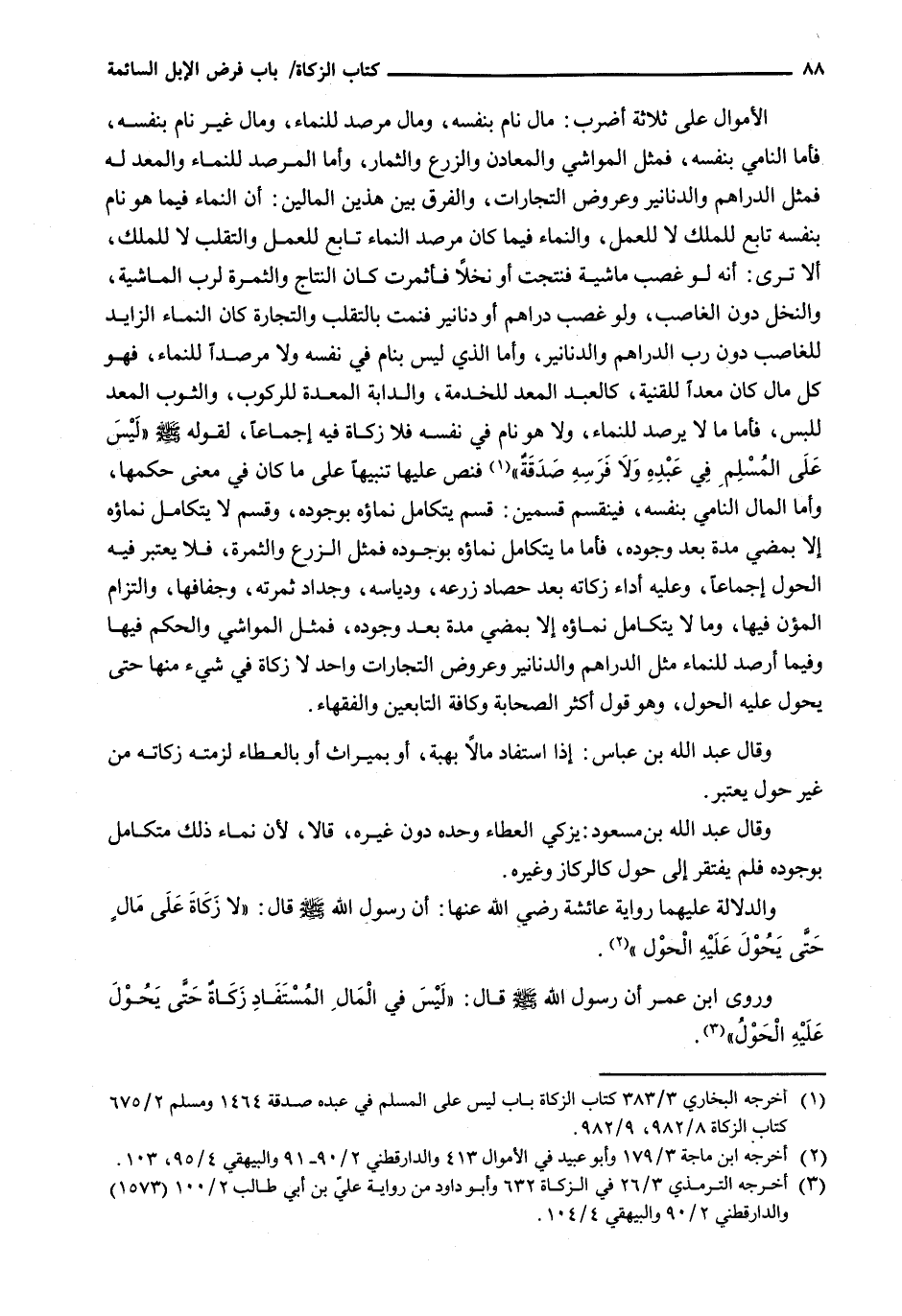 الْأَمْوَالُ عَلَى ثَلَاثَةٍ أَضْرُبٍ: مَالٌ نَامٍ بِنَفْسِهِ، وَمَالٌ مُرْصَدٌ لِلنَّمَاءِ، وَمَالٌ غَيْرُ نَامٍ بِنَفْسِهِ، فَأَمَّا النَّامِي بِنَفْسِهِ، فَمِثْلُ الْمَوَاشِي وَالْمَعَادِنِ وَالزَّرْعِ وَالثِّمَارِ، وَأَمَّا الْمُرْصَدُ لِلنَّمَاءِ وَالْمُعَدُّ لَهُ فَمِثْلُ الدَّرَاهِمِ وَالدَّنَانِيرِ وَعُرُوضِ التِّجَارَاتِ، وَالْفَرْقُ بَيْنَ هَذَيْنِ الْمَالَيْنِ: أَنَّ النَّمَاءَ فِيمَا هُوَ نَامٍ بِنَفْسِهِ تَابِعٌ لِلْمِلْكِ لَا لِلْعَمَلِ، وَالنَّمَاءَ فِيمَا كَانَ مرصد النماء تَابِعٌ لِلْعَمَلِ وَالتَّقَلُّبِ لَا لِلْمِلْكِ، أَلَا تَرَى: أَنَّهُ لَوْ غَصَبَ مَاشِيَةً فَنَتَجَتْ أَوْ نَخْلًا فَأَثْمَرَتْ كَانَ النِّتَاجُ وَالثَّمَرَةُ لِرَبِّ الْمَاشِيَةِ، وَالنَّخْلِ دُونَ الْغَاصِبِ، وَلَوْ غَصَبَ دَرَاهِمَ أَوْ دَنَانِيرَ فنمت بالتقلب والتجارة كان النماء الزايد لِلْغَاصِبِ دُونَ رَبِّ الدَّرَاهِمِ وَالدَّنَانِيرِ، وَأَمَّا الَّذِي ليس بنام في نفسه ولا مرصداً لِلنَّمَاءِ، فَهُوَ كُلُّ مَالٍ كَانَ مُعَدًّا لِلْقِنْيَةِ، كَالْعَبْدِ الْمُعَدِّ لِلْخِدْمَةِ، وَالدَّابَّةِ الْمُعَدَّةِ لِلرُّكُوبِ، وَالثَّوْبِ الْمُعَدِّ لِلُّبْسِ، فَأَمَّا مَا لَا يُرْصَدُ لِلنَّمَاءِ، وَلَا هُوَ نَامٍ فِي نَفْسِهِ فَلَا زَكَاةَ فِيهِ إِجْمَاعًا، لِقَوْلِهِ - صَلَّى اللَّهُ عَلَيْهِ وَسَلَّم َ - " لَيْسَ عَلَى الْمُسْلِمِ فِي عَبْدِهِ وَلَا فَرَسِهِ صدقة " فنص عليها تَنْبِيهًا عَلَى مَا كَانَ فِي مَعْنَى حُكْمِهَا، وَأَمَّا الْمَالُ النَّامِي بِنَفْسِهِ، فَيَنْقَسِمُ قِسْمَيْنِ: قِسْمٌ يَتَكَامَلُ نَمَاؤُهُ بِوُجُودِهِ، وَقِسْمٌ لَا يَتَكَامَلُ نَمَاؤُهُ إِلَّا بِمُضِيِّ مُدَّةٍ بَعْدَ وُجُودِهِ، فَأَمَّا مَا يَتَكَامَلُ نَمَاؤُهُ بِوُجُودِهِ فَمِثْلُ الزَّرْعِ وَالثَّمَرَةِ، فَلَا يُعْتَبَرُ فِيهِ الْحَوْلُ إِجْمَاعًا، وَعَلَيْهِ أَدَاءُ زَكَاتِهِ بعد حصاد زرعة، ودياسه، وجداد ثمرته، وجفافها، والتزام المؤن فيها، وما لا يتكامل نماؤه إلا بمضي مدة بعد وجوده، فمثل المواشي والحكم فِيهَا وَفِيمَا أُرْصِدَ لِلنَّمَاءِ مِثْلُ الدَّرَاهِمِ وَالدَّنَانِيرِ وَعُرُوضِ التِّجَارَاتِ وَاحِدٌ لَا زَكَاةَ فِي شَيْءٍ مِنْهَا حَتَّى يَحُولَ عَلَيْهِ الْحَوْلُ، وَهُوَ قَوْلُ أَكْثَرِ الصَّحَابَةِ وَكَافَّةِ التَّابِعِينَ وَالْفُقَهَاءِ.