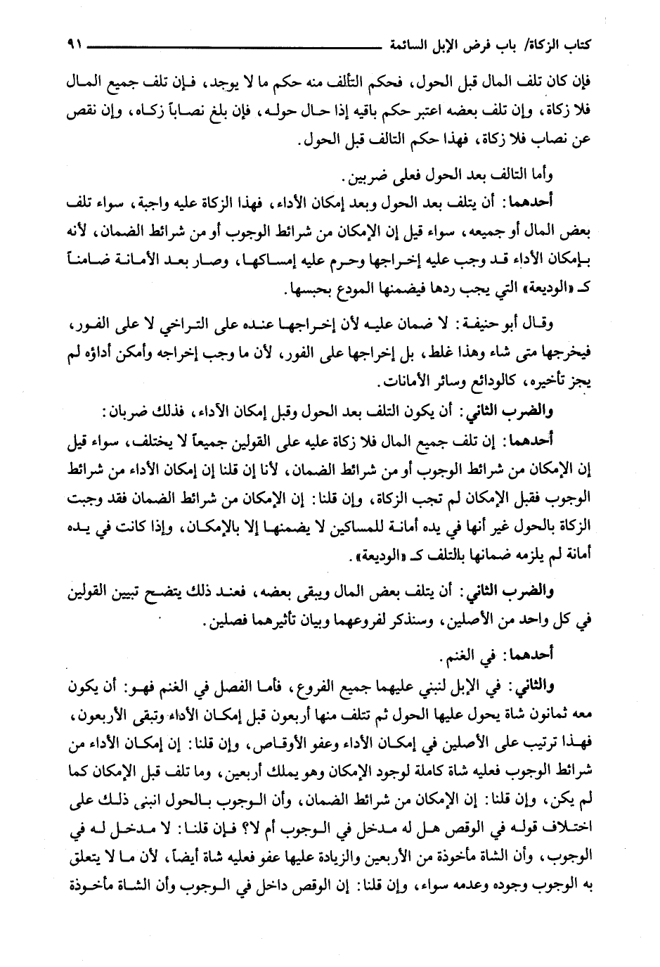 أَحَدُهُمَا: أَنْ يَتْلَفَ بَعْدَ الْحَوْلِ وَبَعْدَ إِمْكَانِ الْأَدَاءِ، فَهَذَا الزَّكَاةُ عَلَيْهِ وَاجِبَةٌ، سَوَاءٌ تَلِفَ بَعْضُ المال أو جميعه، سَوَاءٌ قِيلَ إِنَّ الْإِمْكَانَ مِنْ شَرَائِطِ الْوُجُوبِ أَوْ مِنْ شَرَائِطِ الضَّمَانِ، لِأَنَّهُ بِإِمْكَانِ الْأَدَاءِ قَدْ وَجَبَ عَلَيْهِ إِخْرَاجُهَا وَحَرُمَ عَلَيْهِ إِمْسَاكُهَا، وصار بعد الأمانة ضامناً ك " الوديعة " الَّتِي يَجِبُ رَدُّهَا فَيَضْمَنُهَا الْمُودَعُ بِحَبْسِهَا.