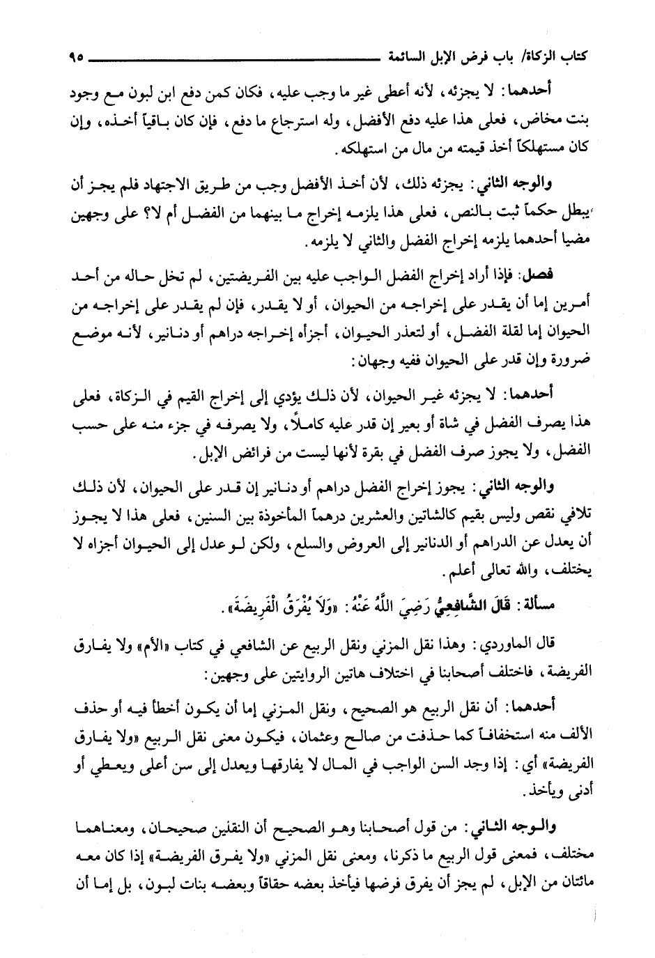 أَحَدُهُمَا: أَنَّ نَقْلَ الرَّبِيعِ هُوَ الصَّحِيحُ، وَنَقْلَ الْمُزَنِيِّ إِمَّا أَنْ يَكُونَ أَخْطَأَ فِيهِ أَوْ حَذَفَ الْأَلِفَ منه اسْتِخْفَافًا كَمَا حُذِفَتْ مِنْ صَالِحٍ وَعُثْمَانَ، فَيَكُونَ مَعْنَى نَقْلِ الرَّبِيعِ " وَلَا يُفَارِقُ الْفَرِيضَةَ " أَيْ: إذا وجد السن الواجب فِي الْمَالِ لَا يُفَارِقُهَا وَيَعْدِلُ إِلَى سِنٍّ أَعْلَى وَيُعْطِي أَوْ أَدْنَى وَيَأْخُذُ.