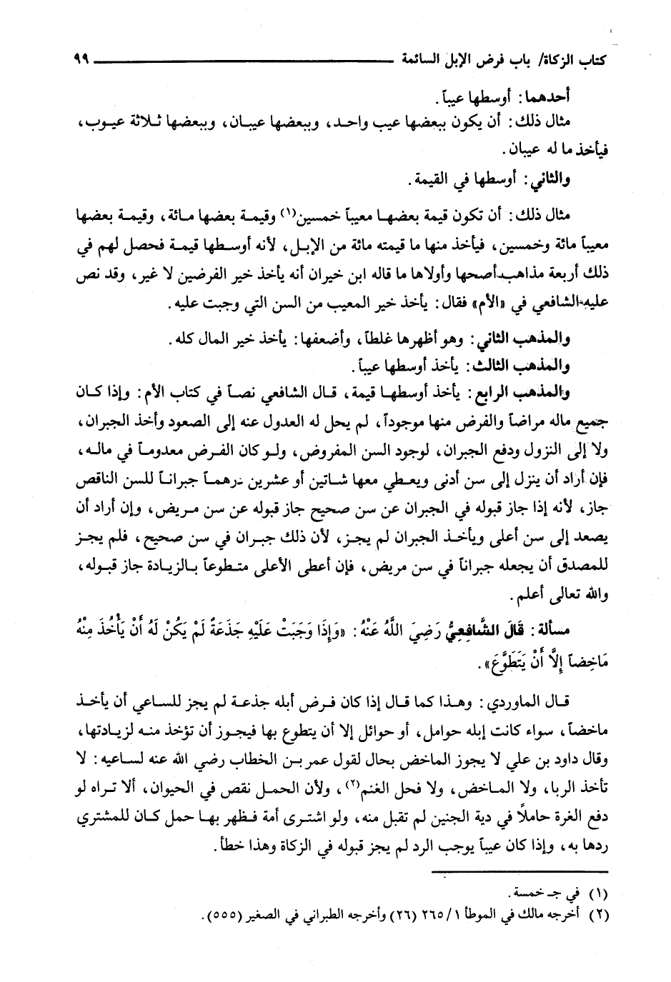 مِثَالُ ذَلِكَ: أَنْ تَكُونَ قِيمَةُ بَعْضِهَا مَعِيبًا خَمْسِينَ وَقِيمَةُ بعضها مِائَةً، وَقِيمَةُ بَعْضِهَا مَعِيبًا مِائَةً وَخَمْسِينَ، فَيَأْخُذَ مِنْهَا مَا قِيمَتُهُ مِائَةٌ مِنَ الْإِبِلِ، لِأَنَّهُ أَوْسَطُهَا قِيمَةً فَحَصَلَ لَهُمْ فِي ذَلِكَ أَرْبَعَةُ مَذَاهِبَ أَصَحُّهَا وَأَوْلَاهَا مَا قَالَهُ ابْنُ خَيْرَانَ إِنَّهُ يَأْخُذُ خَيْرَ الْفَرْضَيْنِ لَا غَيْرَ، وَقَدْ نَصَّ عَلَيْهِ الشَّافِعِيُّ فِي " الْأُمِّ " فَقَالَ: يَأْخُذُ خير المعيب من السن التي وجبت عليه.