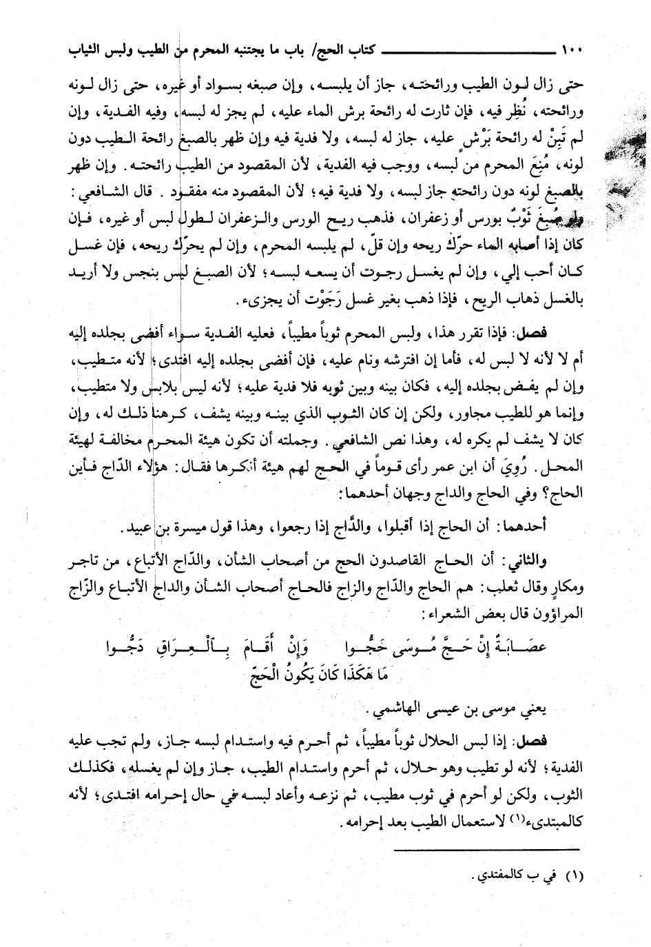 : فَإِذَا تَقَرَّرَ هَذَا، وَلَبِسَ الْمُحْرِمُ ثَوْبًا مُطَيَّبًا، فَعَلَيْهِ الْفِدْيَةُ سَوَاءٌ أَفْضَى بِجِلْدِهِ إِلَيْهِ أَمْ لَا لِأَنَّهُ لَا لُبْسَ لَهُ، فَأَمَّا إِنِ افْتَرَشَهُ وَنَامَ عَلَيْهِ، فَإِنْ أَفْضَى بِجِلْدِهِ إِلَيْهِ افْتَدَى؛ لِأَنَّهُ مُتَطَيِّبٌ، وَإِنْ لَمْ يُفْضِ بِجِلْدِهِ إِلَيْهِ، فَكَانَ بَيْنَهُ وَبَيْنَ ثَوْبِهِ فَلَا فِدْيَةَ عَلَيْهِ؛ لِأَنَّهُ لَيْسَ بِلَابِسٍ وَلَا مُتَطَيِّبٍ، وَإِنَّمَا هُوَ لِلطِّيبِ مُجَاوِرٌ، وَلَكِنْ إِنْ كَانَ الثَّوْبُ الَّذِي بَيْنَهُ وَبَيْنَهُ يَشِفُّ، كَرِهنَا ذَلِكَ لَهُ، وَإِنْ كَانَ لَا يَشِفُّ لَمْ يُكْرَهْ لَهُ، وَهَذَا نَصُّ الشَّافِعِيِّ. وَجُمْلَتُهُ أَنْ تَكُونَ هَيْئَةُ الْمُحْرِمِ مُخَالِفَةً لِهَيْئَةِ الْمَحَلِّ. رُوِيَ أَنَّ ابْنَ عُمَرَ رَأَى قَوْمًا في الْحَجِّ لَهُمْ هَيْئَةٌ أَنْكَرَهَا فَقَالَ: هَؤُلَاءِ الدَّاجُّ فَأَيْنَ الْحَاجُّ؟ وَفِي الْحَاجِّ وَالدَّاجِّ وَجْهَانِ أَحَدُهُمَا: