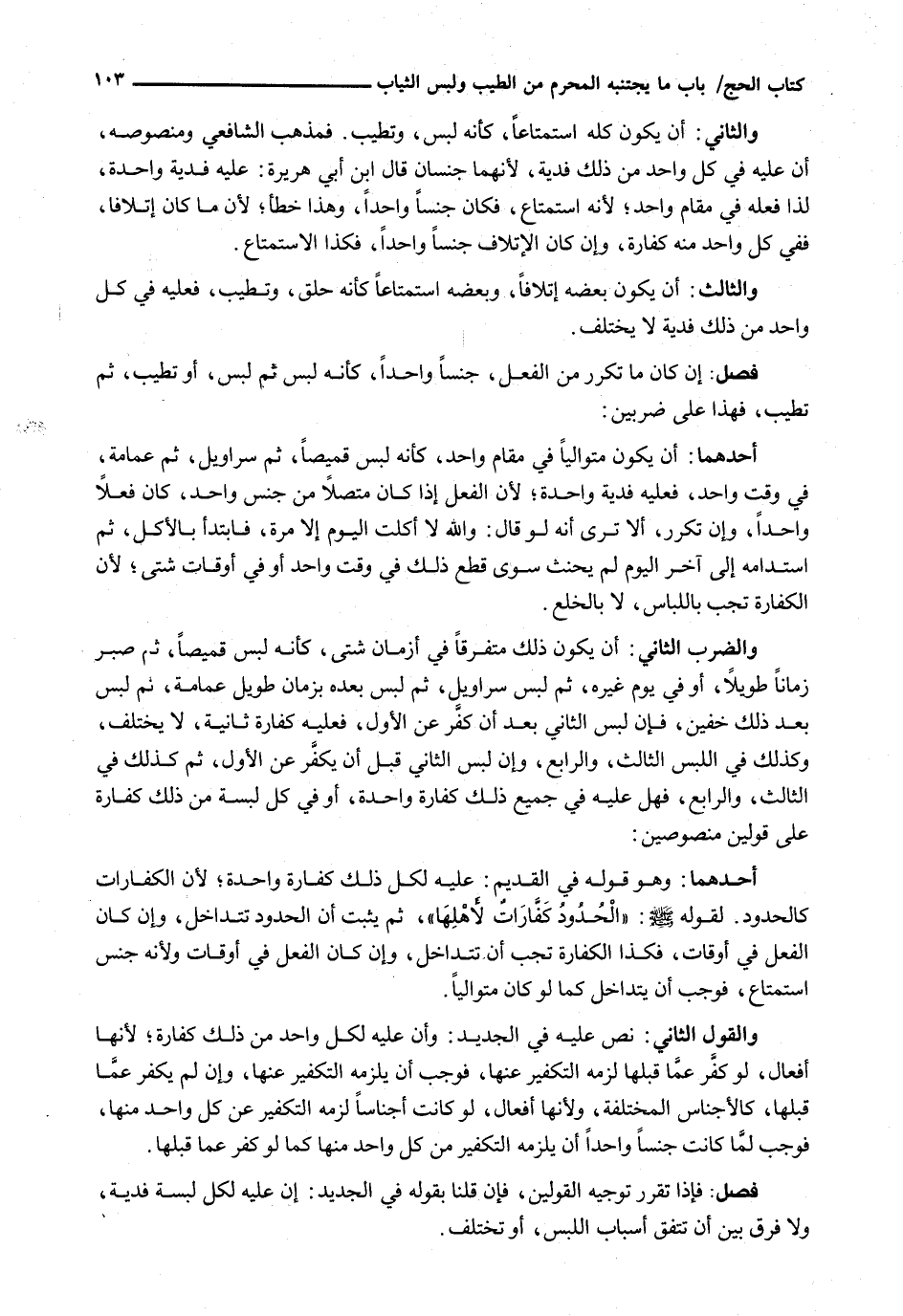 وَالثَّانِي: أَنْ يَكُونَ كُلُّهُ اسْتِمْتَاعًا، كَأَنَّهُ لُبْسٌ، وَتَطَيُّبٌ. فَمَذْهَبُ الشَّافِعِيِّ وَمَنْصُوصُهُ، أَنَّ عَلَيْهِ فِي كُلِّ وَاحِدٍ مِنْ ذَلِكَ فِدْيَةً، لِأَنَّهُمَا جِنْسَانِ قَالَ ابْنُ أَبِي هُرَيْرَةَ: عَلَيْهِ فِدْيَةٌ وَاحِدَةٌ، لذا فَعَلَهُ فِي مَقَامٍ وَاحِدٍ؛ لِأَنَّهُ اسْتِمْتَاعٌ، فَكَانَ جِنْسًا وَاحِدًا، وَهَذَا خَطَأٌ؛ لِأَنَّ مَا كَانَ إِتْلَافًا، فَفِي كُلِّ وَاحِدٍ مِنْهُ كَفَّارَةٌ، وَإِنْ كَانَ الْإِتْلَافُ جِنْسًا وَاحِدًا، فَكَذَا الِاسْتِمْتَاعُ.