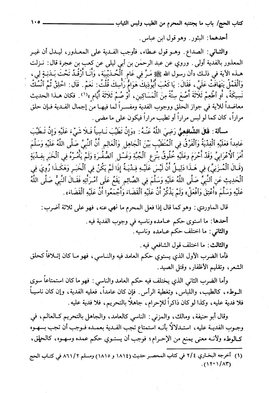 قَالَ الْمَاوَرْدِيُّ: وَهُوَ كَمَا قَالَ إِذَا فَعَلَ الْمُحْرِمُ مَا نُهِيَ عَنْهُ، فَهُوَ عَلَى ثَلَاثَةِ أَضْرُبٍ: