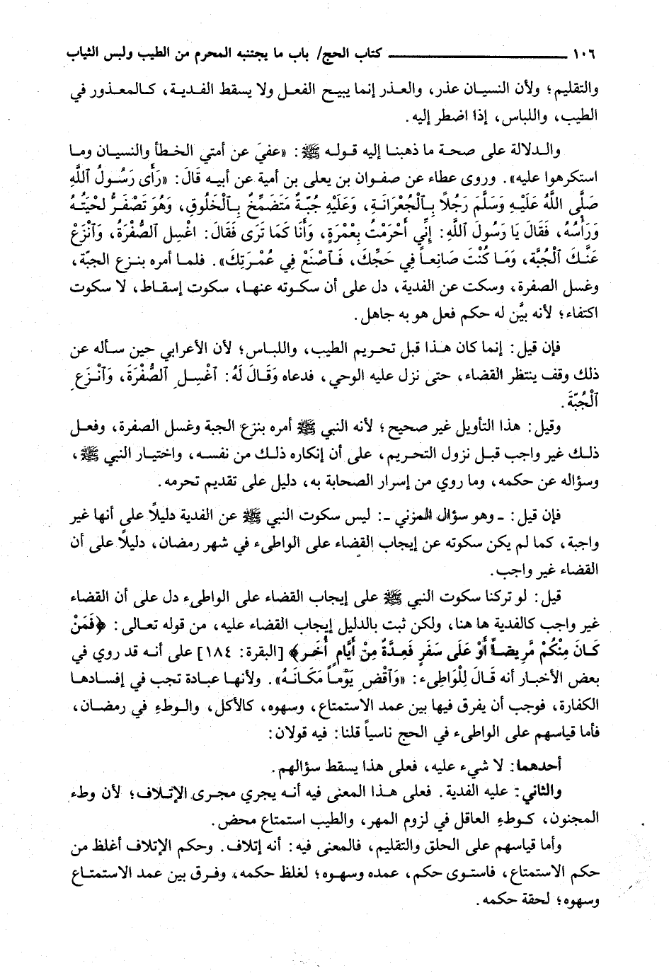وَالدَّلَالَةُ عَلَى صِحَّةِ مَا ذَهَبْنَا إِلَيْهِ قَوْله - صَلَّى اللَّهُ عَلَيْهِ وَسَلَّم َ -: " عُفِيَ عَنْ أُمَّتِي الْخَطَأُ وَالنِّسْيَانُ وَمَا اسْتُكْرِهُوا عَلَيْهِ ". وَرَوَى عَطَاءُ عَنْ صَفْوَانَ بْنِ يَعْلَى بْنِ أُمَيَّةَ عَنْ أَبِيهِ قَالَ: " رَأَى رَسُولَ اللَّهِ - صَلَّى اللَّهُ عَلَيْهِ وَسَلَّم َ - رجلاً بالجعرانة، وعليه جبة متضمخ بِالْخَلُوقِ، وَهُوَ تَصْفَرُّ لِحْيَتِهِ وَرَأْسُهُ، فَقَالَ يَا رَسُولَ اللَّهِ: إِنِّي أَحْرَمْتُ بعمرةٍ، وَأَنَا كَمَا تَرَى فَقَالَ: اغْسِلِ الصُّفْرَةَ، وَانْزَعْ عَنْكَ الْجُبَّةَ، وَمَا كُنْتَ صَانِعًا فِي حَجِّكَ، فَاصْنَعْ فِي عُمْرَتِكَ ". فَلَمَّا أَمَرَهُ بِنَزْعِ الْجُبَّةِ، وَغَسْلِ الصُّفْرَةِ، وَسَكَتَ عَنِ الْفِدْيَةِ، دَلَّ عَلَى أَنَّ سُكُوتَهُ عَنْهَا، سُكُوتُ إِسْقَاطٍ، لَا سُكُوتَ اكْتِفَاءٍ؛ لِأَنَّهُ بَيَّنَ لَهُ حُكْمَ فِعْلٍ هُوَ بِهِ جَاهِلٌ.