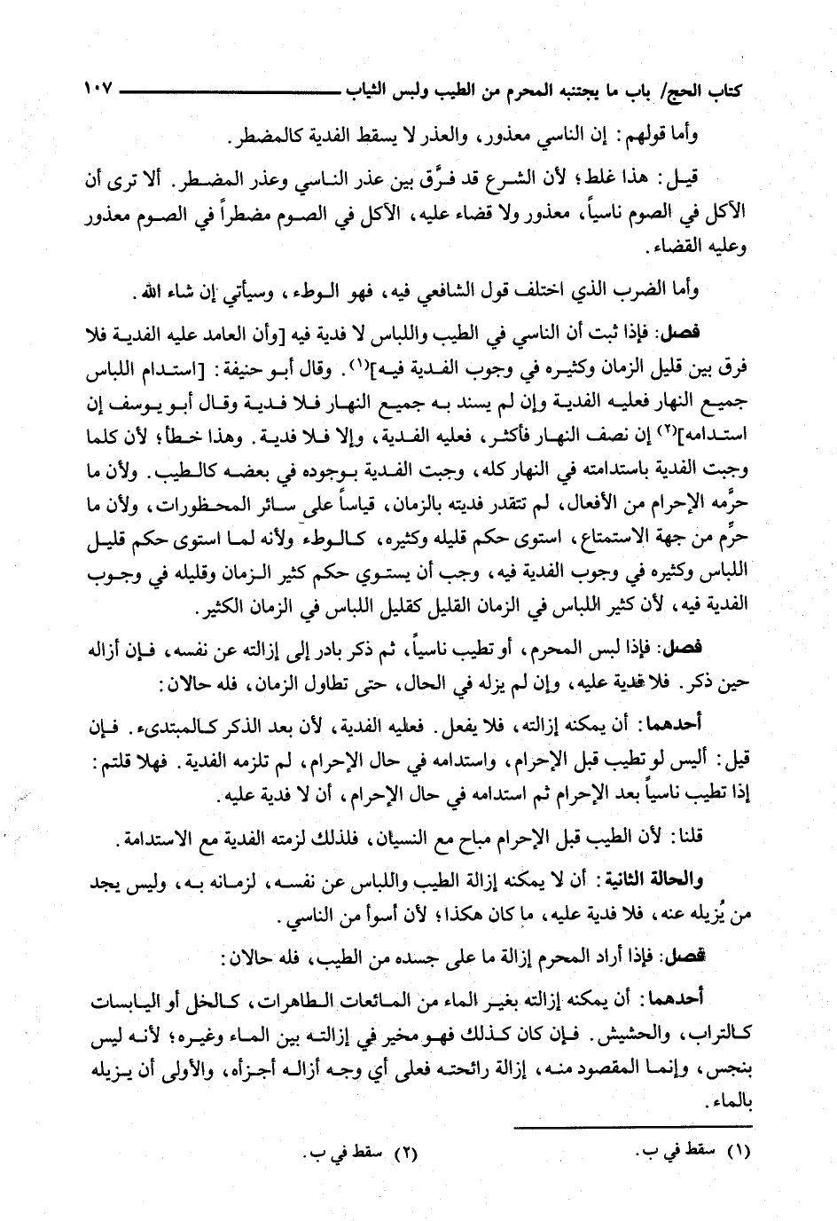 : فَإِذَا ثَبَتَ أَنَّ النَّاسِيَ فِي الطِّيبِ واللباس لا فدية فيه وَأَنَّ الْعَامِدَ عَلَيْهِ الْفِدْيَةُ فَلَا فَرْقَ بَيْنَ قَلِيلِ الزَّمَانِ وَكَثِيرِهِ فِي وُجُوبِ الْفِدْيَةِ فِيهِ. وقال أبو حنيفة: اسْتَدَامَ اللِّبَاسَ جَمِيعَ النَّهَارِ فَعَلَيْهِ الْفِدْيَةُ وَإِنْ لم يسند به جَمِيعَ النَّهَارِ فَلَا فِدْيَةَ وَقَالَ أبو يوسف إن استدامه إن نِصْفَ النَّهَارِ فَأَكْثَرَ، فَعَلَيْهِ الْفِدْيَةُ، وَإِلَّا فَلَا فدية. وهذا خطأ؛ لأن كُلَّمَا وَجَبَتِ الْفِدْيَةُ بِاسْتِدَامَتِهِ فِي النَّهَارِ كُلِّهِ، وَجَبَتِ الْفِدْيَةُ بِوِجُودِهِ فِي بَعْضِهِ كَالطِّيبِ. وَلِأَنَّ مَا حَرَّمَهُ الْإِحْرَامُ مِنَ الْأَفْعَالِ، لَمْ تَتَقَدِرْ فِدْيَتُهُ بِالزَّمَانِ، قِيَاسًا عَلَى سَائِرِ الْمَحْظُورَاتِ، وَلِأَنَّ مَا حُرِّمَ مِنْ جِهَةِ الِاسْتِمْتَاعِ، اسْتَوَى حُكْمُ قَلِيلِهِ وَكَثِيرِهِ، كَالْوَطْءِ وَلِأَنَّهُ لَمَّا اسْتَوَى حُكْمُ قَلِيلِ اللِّبَاسِ وَكَثِيرِهِ فِي وُجُوبِ الْفِدْيَةِ فِيهِ، وَجَبَ أَنْ يَسْتَوِيَ حُكْمُ كَثِيرِ الزَّمَانِ وَقَلِيلِهِ فِي وُجُوبِ الْفِدْيَةِ فِيهِ، لِأَنَّ كَثِيرَ اللِّبَاسِ فِي الزَّمَانِ الْقَلِيلِ كَقَلِيلِ اللِّبَاسِ فِي الزَّمَانِ الْكَثِيرِ.