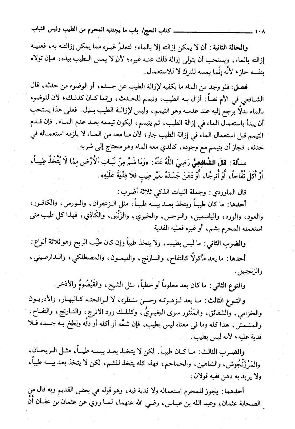 : قال الشافعي رضي الله عنه: " وَمَا شَمَّ مِنْ نَبَاتِ الْأَرْضِ مِمَّا لَا يُتَّخَذُ طِيبًا، أَوْ أَكَلَ تُفَّاحًا، أَوْ أُتْرُجًّا، أَوْ دَهَنَ جَسَدَهُ بِغَيْرِ طِيبٍ فَلَا فِدْيَةَ عليه ".
