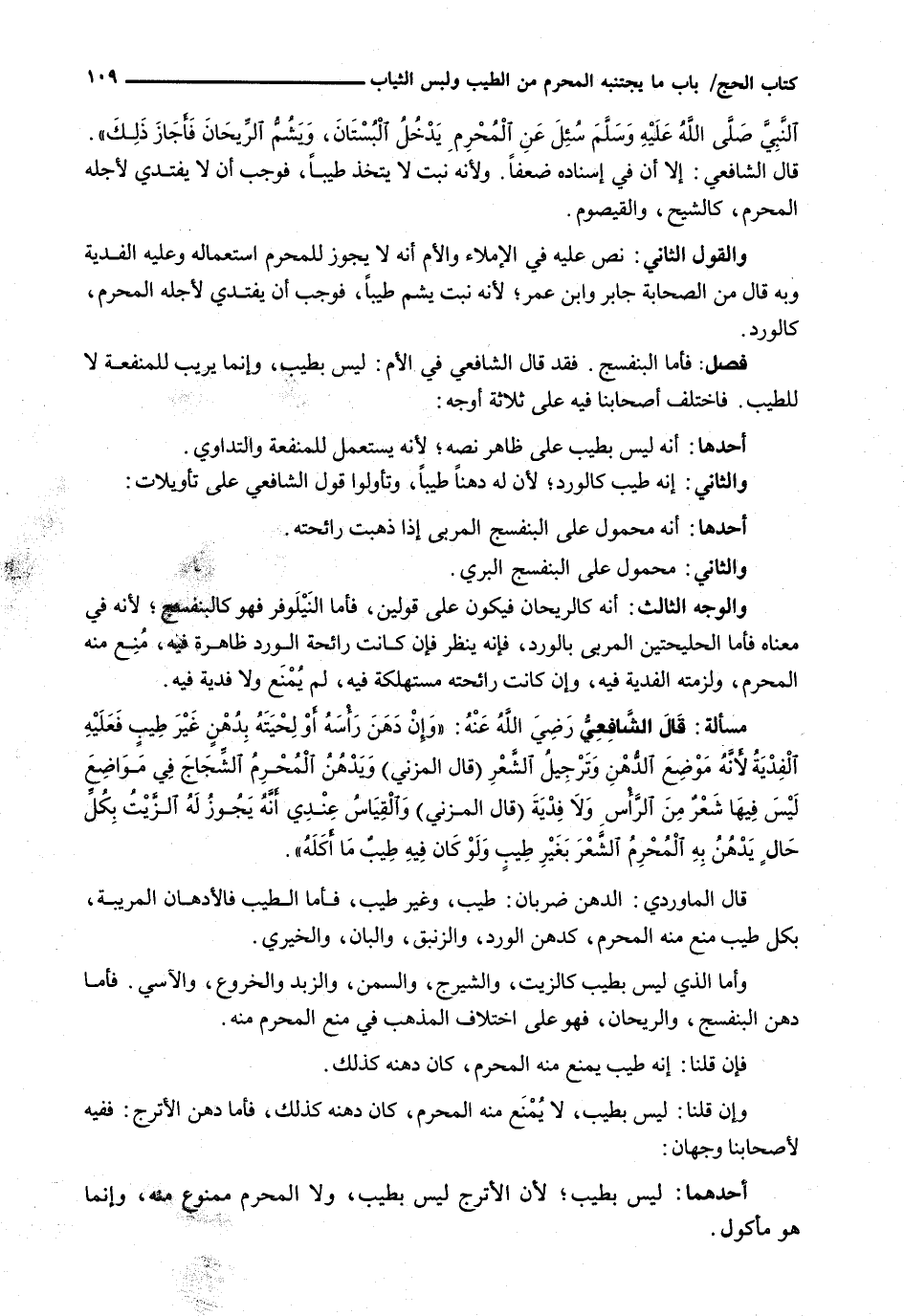 النبي - صَلَّى اللَّهُ عَلَيْهِ وَسَلَّم َ - سُئِلَ عَنِ الْمُحْرِمِ يَدْخُلُ الْبُسْتَانَ، وَيَشُمُّ الرَّيْحَانَ فَأَجَازَ ذَلِكَ ". قَالَ الشَّافِعِيُّ: إِلَّا أَنَّ فِي إِسْنَادِهِ ضَعْفًا. وَلِأَنَّهُ نَبْتٌ لَا يُتَّخَذُ طِيبًا، فَوَجَبَ أَنْ لَا يَفْتَدِيَ لِأَجْلِهِ الْمُحْرِمُ، كَالشِّيحِ، وَالْقَيْصُومِ.