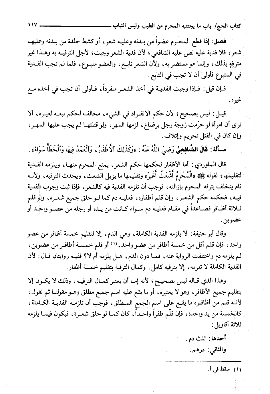 وَهَذَا الَّذِي قَالَهُ لَيْسَ بِصَحِيحٍ؛ لِأَنَّهُ إِمَّا أَنْ يَعْتَبِرَ كَمَالَ التَّرْفِيهِ، وَذَلِكَ لَا يَكُونُ إِلَّا بِتَقْلِيمِ جَمِيعِ الْأَظَافِرِ، وَهُوَ لَا يَعْتَبِرُهُ، أَوْ ما يقع عليه اسم جميع مطلق وهو مقولنا ثُمَّ نَقُولُ: لِأَنَّهُ قَلَّمَ مِنْ أَظَافِرِهِ مَا يَقَعُ عَلَى اسْمِ الْجَمْعِ الْمُطْلَقِ، فَوَجَبَ أَنْ تَلْزَمَهُ الْفِدْيَةُ الْكَامِلَةُ، كَالْخَمْسَةِ مِنْ يَدٍ وَاحِدَةٍ، فَإِنْ قَلَّمَ ظُفْرًا وَاحِدًا، كَانَ كَمَا لَوْ حَلَقَ شَعْرَةً، فَيَكُونُ فِيمَا يَلْزَمُهُ ثَلَاثَةُ أَقَاوِيلَ:
