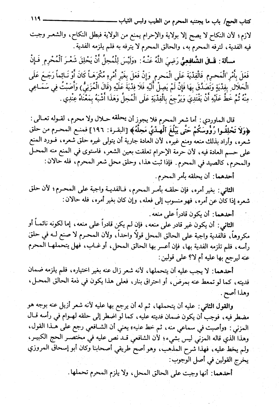 قَالَ الْمَاوَرْدِيُّ: أَمَّا شَعْرُ الْمُحْرِمِ فَلَا يَجُوزُ أَنْ يَحْلِقَهُ حَلَالٌ وَلَا مُحْرِمٌ، لِقَوْلِهِ تَعَالَى: {وَلاَ تَحْلِقُواْ رُؤُوسَكُمْ حَتَّى يَبْلُغَ الهَدْيُ مَحِلَّهُ) {البقرة: 196) فَمَنَعَ الْمُحْرِمَ مِنْ حَلْقِ شَعْرِهِ، وَأَرَادَ بِذَلِكَ مَنْعَهُ وَمَنْعَ غَيْرِهِ، لِأَنَّ الْعَادَةَ جَارِيَةٌ أَنْ يَتَوَلَّى غَيْرُهُ حَلْقَ شَعْرِهِ، فَوَرَدَ الْمَنْعُ عَلَى حَسْمِ الْعَادَةِ فِيهِ، لِأَنَّ حُرْمَةَ الْإِحْرَامِ تَعَلَّقَتْ بِعَيْنِ الشَّعْرِ، فَاسْتَوَى فِي الْمَنْعِ مِنْهُ الْمُحِلُّ وَالْمُحْرِمُ، كَالصَّيْدِ فِي الْمُحْرِمِ. فَإِذَا ثَبَتَ هَذَا، وَحَلَقَ مَحَلَّ شَعْرِ الْمُحْرِمِ، فَلَهُ حَالَانِ: