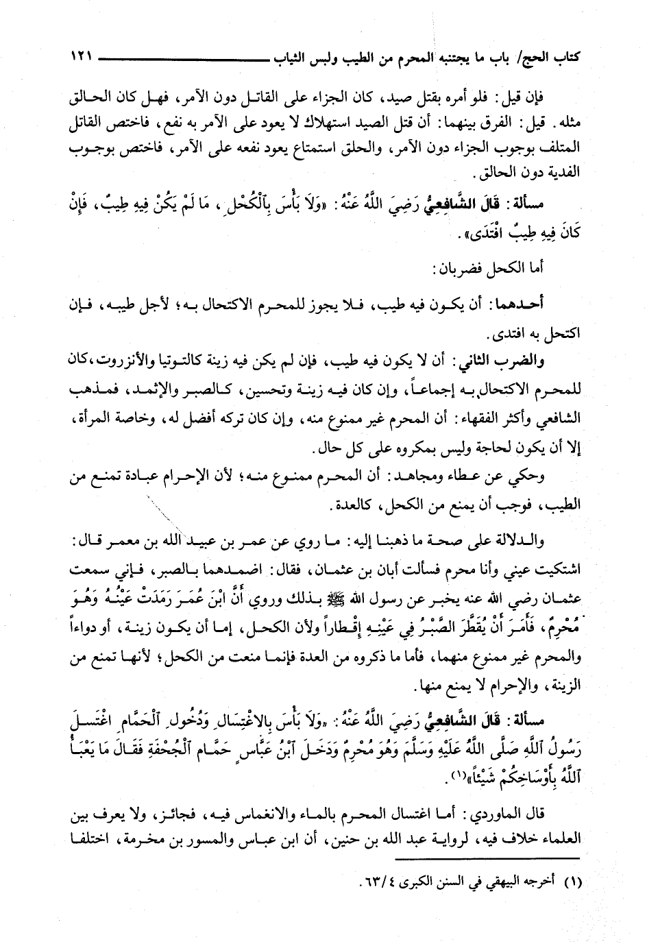 : قال الشافعي رضي الله عنه: " وَلَا بَأْسَ بِالْكُحْلِ، مَا لَمْ يَكُنْ فِيهِ طيب، فإن كان فيه طيب افتدى ".