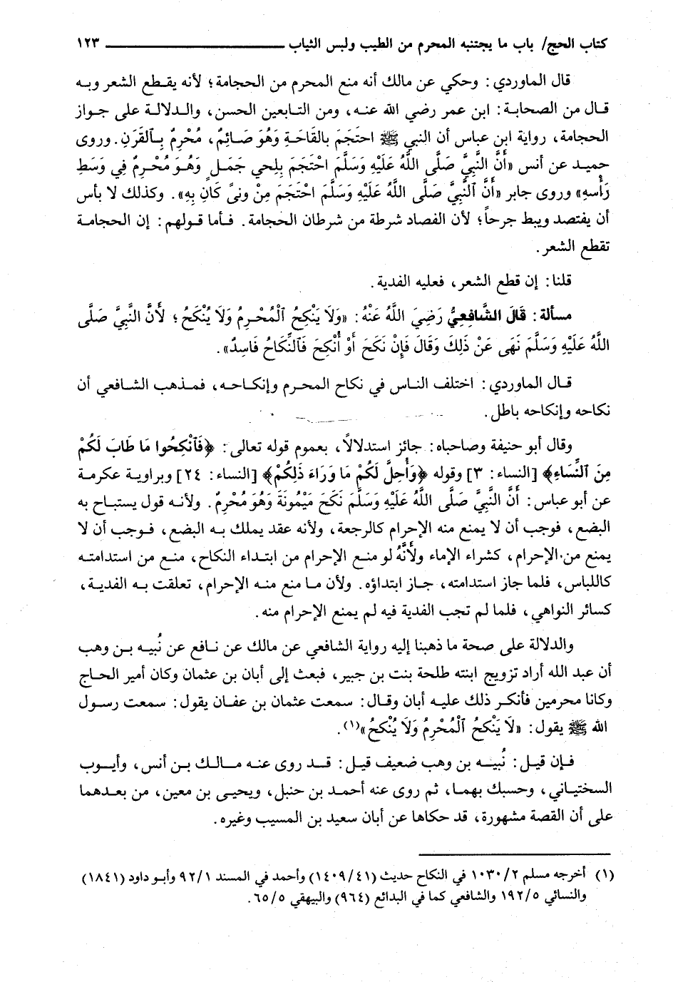 قَالَ الْمَاوَرْدِيُّ: وَحُكِيَ عَنْ مَالِكٍ أَنَّهُ مَنَعَ الْمُحْرِمَ مِنَ الْحِجَامَةِ؛ لِأَنَّهُ يَقْطَعُ الشَّعْرَ وَبِهِ قَالَ مِنَ الصَّحَابَةِ: ابْنُ عُمَرَ رَضِيَ اللَّهُ عَنْهُ، وَمِنَ التَّابِعِينَ الْحَسَنُ، وَالدَّلَالَةُ عَلَى جَوَازِ الْحِجَامَةِ، رِوَايَةُ ابْنِ عَبَّاسٍ أَنَّ النَّبِيَّ - صَلَّى اللَّهُ عَلَيْهِ وَسَلَّم َ - احْتَجَمَ بِالْقَاحَةِ وَهُوَ صَائِمٌ، مُحْرِمٌ بِالْقَرَنِ. وَرَوَى حميد عَنْ أَنَسٍ " أَنَّ النَّبِيَّ - صَلَّى اللَّهُ عَلَيْهِ وَسَلَّم َ - احْتَجَمَ بِلَحْيِ جملٍ وَهُوَ مُحْرِمٌ فِي وَسَطِ رَأْسِهِ " وَرَوَى جَابِرٍ " أَنَّ النَّبِيَّ - صَلَّى اللَّهُ عَلَيْهِ وَسَلَّم َ - احْتَجَمَ مِنْ وَنًى كَانِ بِهِ ". وَكَذَلِكَ لَا بَأْسَ أَنْ يَفْتَصِدَ وَيَبُطَّ جُرْحًا؛ لِأَنَّ الْفِصَادَ شرطة من شرطان الْحِجَامَةِ. فَأَمَّا قَوْلُهُمْ: إِنَّ الْحِجَامَةَ تَقْطَعُ الشَّعْرَ.