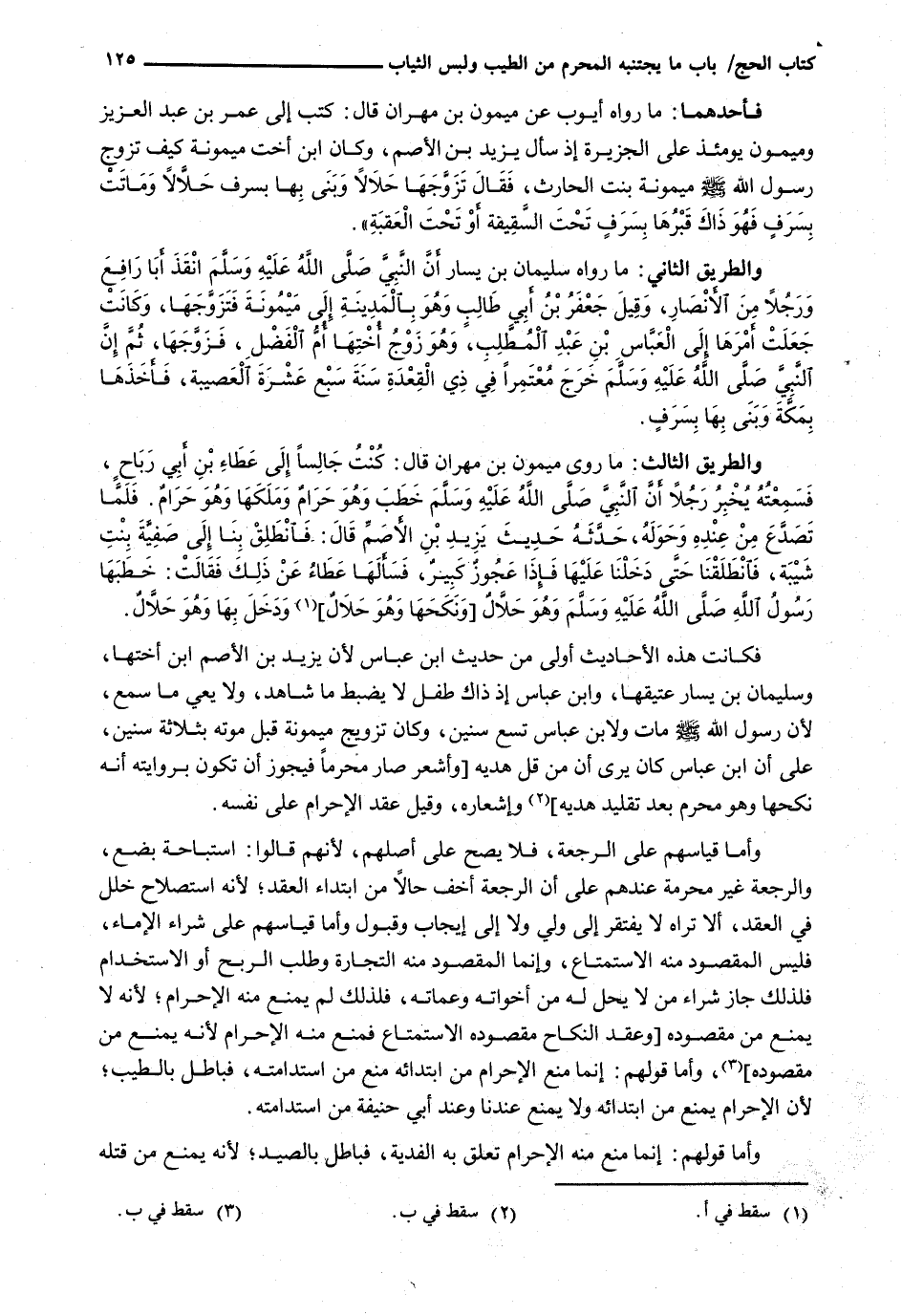 فَكَانَتْ هَذِهِ الْأَحَادِيثُ أَوْلَى مِنْ حَدِيثِ ابْنِ عَبَّاسٍ لِأَنَّ يَزِيدَ بْنَ الْأَصَمِّ ابْنُ أُخْتِهَا، وَسُلَيْمَانَ بْنَ يَسَارٍ عَتِيقُهَا، وَابْنُ عَبَّاسٍ إِذْ ذَاكَ طِفْلٌ لَا يَضْبُطُ مَا شَاهَدَ، وَلَا يَعِي مَا سَمِعَ، لِأَنَّ رَسُولَ اللَّهِ - صَلَّى اللَّهُ عَلَيْهِ وَسَلَّم َ - مَاتَ وَلِابْنِ عَبَّاسٍ تِسْعُ سِنِينَ، وَكَانَ تَزْوِيجُ ميمونة قبل موته بثلاثة سِنِينَ، عَلَى أَنَّ ابْنَ عَبَّاسٍ كَانَ يَرَى أن من قل هديه وأشعر صَارَ مُحْرِمًا فَيَجُوزُ أَنْ تَكُونَ بِرِوَايَتِهِ أَنَّهُ نَكَحَهَا وَهُوَ مُحْرِمٌ بَعْدَ تَقْلِيدِ هَدْيِهِ وَإِشْعَارِهِ، وَقِيلَ عَقَدَ الْإِحْرَامَ عَلَى نَفْسِهِ.