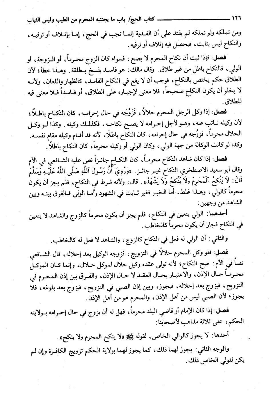 : فَإِذَا ثَبَتَ أَنَّ نِكَاحَ الْمُحْرِمِ لَا يَصِحُّ، فَسَوَاءٌ كَانَ الزَّوْجُ مُحْرِمًا، أَوِ الزَّوْجَةُ، أَوِ الْوَلِيُّ، فَالنِّكَاحُ بَاطِلٌ مِنْ غَيْرِ طَلَاقٍ. وَقَالَ مَالِكٌ: هُوَ فَاسِدٌ يُفْسَخُ بِطَلْقَةٍ. وَهَذَا خَطَأٌ؛ لِأَنَّ الطَّلَاقَ حُكْمٌ يَخْتَصُّ بِالنِّكَاحِ، فَوَجَبَ أَنْ لَا يَقَعَ فِي النِّكَاحِ الْفَاسِدِ، كَالظِّهَارِ وَاللِّعَانِ، وَلِأَنَّهُ لَا يَخْلُو أَنْ يَكُونَ النِّكَاحُ صَحِيحًا، فَلَا مَعْنَى لِإِجْبَارِهِ عَلَى الطَّلَاقِ، أَوْ فَاسِدًا فَلَا مَعْنَى فِيهِ لِلطَّلَاقِ.