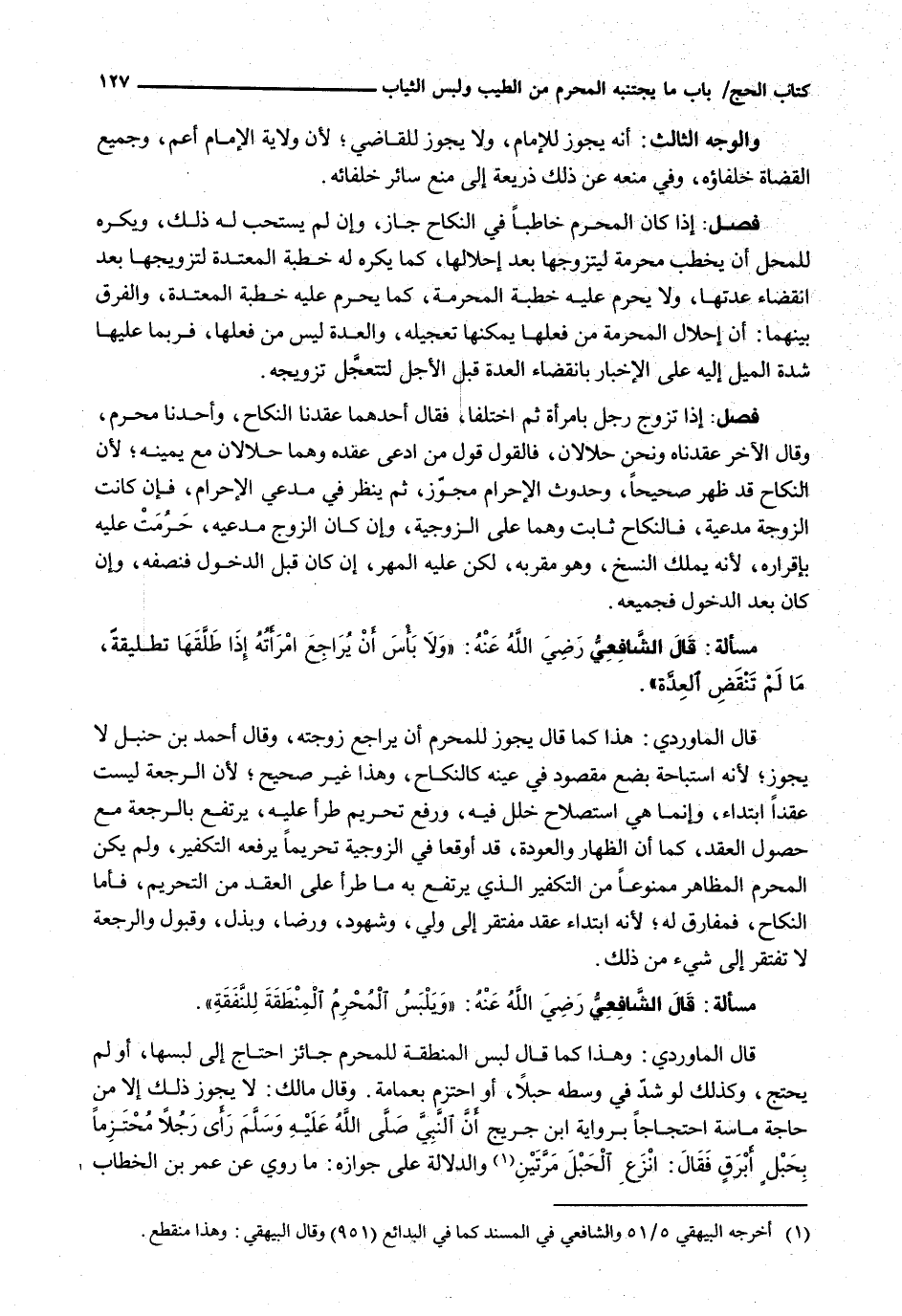 قَالَ الْمَاوَرْدِيُّ: وَهَذَا كَمَا قَالَ لُبْسُ الْمِنْطَقَةِ لِلْمُحْرِمِ جَائِزٌ احْتَاجَ إِلَى لُبْسِهَا، أَوْ لَمْ يَحْتَجْ، وَكَذَلِكَ لَوْ شَدَّ فِي وَسَطِهِ حَبْلًا، أَوِ احْتَزَمَ بِعِمَامَةٍ. وقال مالك: لا يجوز ذلك إلا في حجة مَاسَّةٍ احْتِجَاجًا بِرِوَايَةِ ابْنِ جُرَيْجٍ أَنَّ النَّبِيَّ - صَلَّى اللَّهُ عَلَيْهِ وَسَلَّم َ - رَأَى رَجُلًا مُحْتَزِمًا بِحَبْلٍ أَبْرَقَ فَقَالَ: انْزَعِ الْحَبْلَ مَرَّتَيْنِ وَالدَّلَالَةُ عَلَى جَوَازِهِ: مَا رُوِيَ عَنْ عُمَرَ بْنِ الْخَطَّابِ