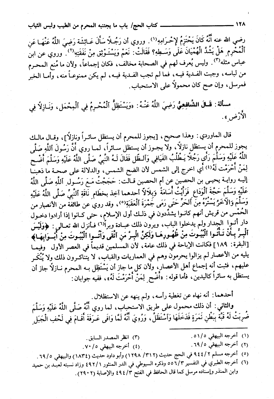 : قال الشافعي رضي الله عنه: " وَيَسْتَظِلُّ الْمُحْرِمُ فِي الْمَحْمَلِ، وَنَازِلًا فِي الْأَرْضِ ".