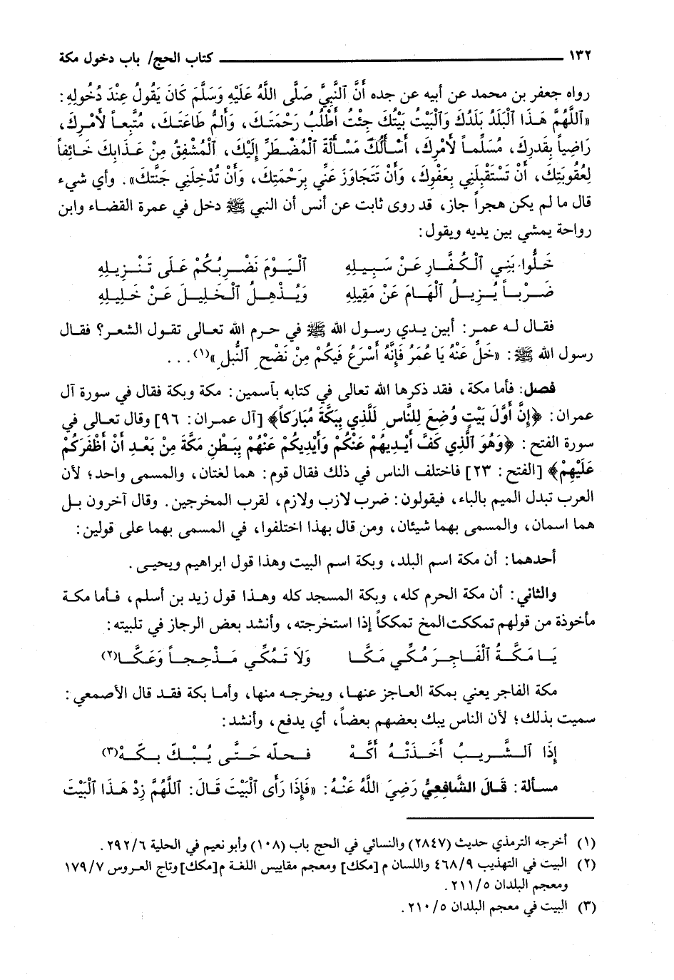 : فَأَمَّا مَكَّةُ، فَقَدْ ذَكَرَهَا اللَّهُ تَعَالَى فِي كِتَابِهِ بِاسْمَيْنِ: مَكَّةُ وَبَكَّةُ فَقَالَ فِي سُورَةِ آلِ عِمْرَانَ: {إِنَّ أَوَّلَ بَيْتٍ وُضِعَ لِلنَّاسِ لَلَّذِي بِبَكَّةَ مُبَارَكاً) {آل عمران: 96) وَقَالَ تَعَالَى فِي سُورَةِ الْفَتْحِ: {وَهُوَ الذِي كَفَّ أيْدِيهُمْ عَنْكُمْ وَأَيْدِيَكُمْ عَنْهُمْ بِبَطْنِ مَكَّةَ مِنْ بَعْدِ أَنْ أظْفَرَكُمْ عَلَيْهِمْ) {الفتح: 23) فَاخْتَلَفَ النَّاسُ فِي ذَلِكَ فَقَالَ قَوْمٌ: هُمَا لُغَتَانِ، وَالْمُسَمَّى وَاحِدٌ؛ لِأَنَّ الْعَرَبَ تُبْدِلُ الْمِيمَ بِالْبَاءِ، فَيَقُولُونَ ضَرْبٌ لَازِبٌ وَلَازِمٌ، لِقُرْبِ الْمَخْرَجَيْنِ. وَقَالَ آخَرُونَ بَلْ هُمَا اسْمَانِ، وَالْمُسَمَّى بِهِمَا شَيْئَانِ، وَمَنْ قَالَ بِهَذَا اخْتَلَفُوا، فِي الْمُسَمَّى بِهِمَا عَلَى قَوْلَيْنِ: