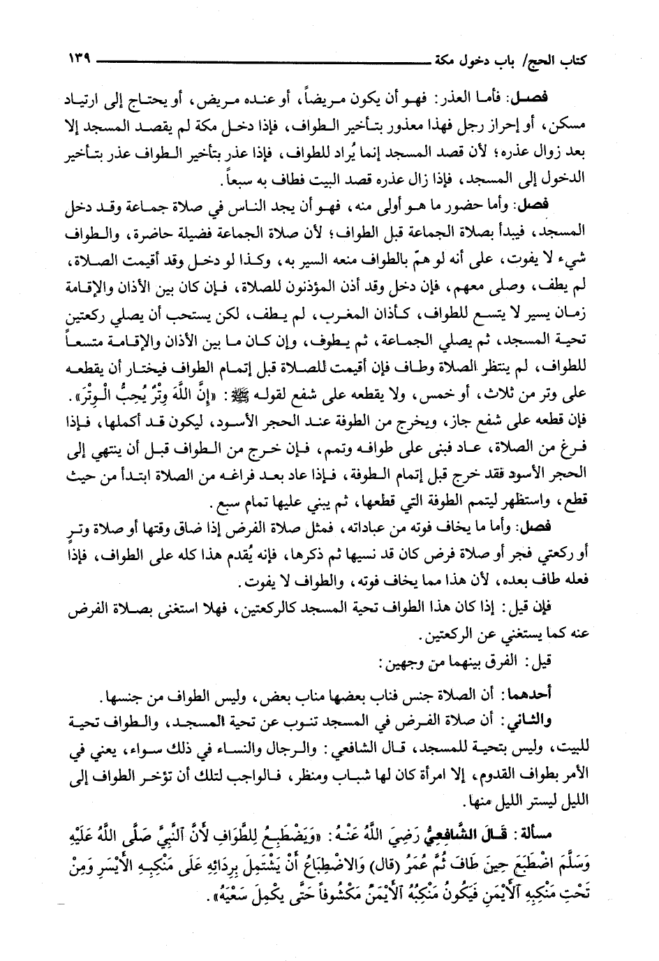 : وَأَمَّا حُضُورُ مَا هُوَ أَوْلَى مِنْهُ، فَهُوَ أَنْ يَجِدَ النَّاسَ فِي صَلَاةِ جَمَاعَةٍ وَقَدْ دَخَلَ الْمَسْجِدَ، فَيَبْدَأُ بِصَلَاةِ الْجَمَاعَةِ قَبْلَ الطَّوَافِ؛ لِأَنَّ صَلَاةَ الْجَمَاعَةِ فَضِيلَةٌ حَاضِرَةٌ، وَالطَّوَافُ شَيْءٌ لَا يَفُوتُ، عَلَى أَنَّهُ لَوْ هَمَّ بِالطَّوَافِ مَنَعَهُ السَّيْرُ بِهِ، وَكَذَا لَوْ دَخَلَ وَقَدْ أُقِيمَتِ الصَّلَاةُ، لَمْ يَطُفْ، وَصَلَّى مَعَهُمْ، فَإِنْ دَخَلَ وَقَدْ أَذَّنَ الْمُؤَذِّنُونَ لِلصَّلَاةِ، فَإِنْ كَانَ بَيْنَ الْأَذَانِ وَالْإِقَامَةِ زَمَانٌ يَسِيرٌ لَا يَتَّسِعُ لِلطَّوَافِ، كَأَذَانِ الْمَغْرِبِ، لَمْ يَطُفْ، لَكِنْ يُسْتَحَبُّ أَنْ يُصَلِّيَ رَكْعَتَيْنِ تَحِيَّةَ الْمَسْجِدِ، ثُمَّ يُصَلِّي الْجَمَاعَةَ، ثُمَّ يَطُوفُ، وَإِنْ كَانَ مَا بَيْنَ الْأَذَانِ وَالْإِقَامَةِ مُتَّسَعًا لِلطَّوَافِ، لَمْ يَنْتَظِرِ الصَّلَاةَ وطاف فإن أقيمت للصلاة قَبْلَ إِتْمَامِ الطَّوَافِ فَيَخْتَارُ أَنْ يَقْطَعَهُ عَلَى وِتْرٍ مِنْ ثَلَاثٍ، أَوْ خَمْسٍ، وَلَا يَقْطَعُهُ عَلَى شَفْعٍ لِقَوْلِهِ - صَلَّى اللَّهُ عَلَيْهِ وَسَلَّم َ -: " إِنَّ اللَّهَ وِتْرٌ يُحِبُّ الْوِتْرَ ". فَإِنْ قَطَعَهُ على شفع جاز، ويخرج من الطوفة عِنْدَ الْحَجَرِ الْأَسْوَدِ، لِيَكُونَ قَدْ أَكْمَلَهَا، فَإِذَا فَرَغَ مِنَ الصَّلَاةِ، عَادَ فَبَنَى عَلَى طَوَافِهِ وَتَمَّمَ، فَإِنْ خَرَجَ مِنَ الطَّوَافِ قَبْلَ أَنْ يَنْتَهِيَ إِلَى الْحَجَرِ الْأَسْوَدِ فَقَدْ خَرَجَ قَبْلَ إِتْمَامِ الطَّوْفَةِ، فَإِذَا عَادَ بَعْدَ فَرَاغِهِ مِنَ الصَّلَاةِ ابْتَدَأَ مِنْ حَيْثُ قَطَعَ، وَاسْتَظْهَرَ لِيُتَمِّمَ الطَّوْفَةَ الَّتِي قَطَعَهَا، ثُمَّ يَبْنِي عَلَيْهَا تَمَامَ سَبْعٍ.
