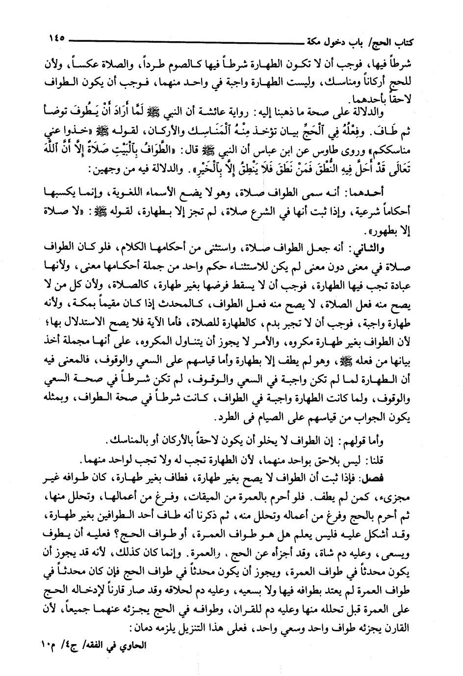 وَالثَّانِي: أَنَّهُ جَعَلَ الطَّوَافَ صَلَاةً، وَاسْتَثْنَى مِنْ أَحْكَامِهَا الْكَلَامَ، فَلَوْ كَانَ الطَّوَافُ صَلَاةً فِي مَعْنًى دُونَ مَعْنًى لَمْ يَكُنْ لِلِاسْتِثْنَاءِ حُكْمٌ وَاحِدٌ مِنْ جُمْلَةِ أَحْكَامِهَا مَعْنًى، وَلِأَنَّهَا عِبَادَةٌ تَجِبُ فِيهَا الطَّهَارَةُ، فَوَجَبَ أَنْ لَا يَسْقُطَ فَرْضُهَا بِغَيْرِ طَهَارَةٍ، كَالصَّلَاةِ، وَلِأَنَّ كُلَّ مَنْ لَا يَصِحُّ مِنْهُ فِعْلُ الصَّلَاةِ، لَا يَصِحُّ مِنْهُ فِعْلُ الطَّوَافِ، كَالْمُحْدِثِ إِذَا كَانَ مُقِيمًا بِمَكَّةَ، وَلِأَنَّهُ طَهَارَةٌ وَاجِبَةٌ، فَوَجَبَ أَنْ لَا تُجْبَرَ بِدَمٍ، كَالطَّهَارَةِ لِلصَّلَاةِ، فَأَمَّا الْآيَةُ فَلَا يَصِحُّ الِاسْتِدْلَالُ بِهَا؛ لِأَنَّ الطَّوَافَ بِغَيْرِ طَهَارَةٍ مَكْرُوهٌ، وَالْأَمْرُ لَا يجوز أن يَتَنَاوَلُ الْمَكْرُوهَ، عَلَى أَنَّهَا مُجْمَلَةٌ أُخِذُ بَيَانُهَا من فعله - صَلَّى اللَّهُ عَلَيْهِ وَسَلَّم َ -، وَهُوَ لَمْ يَطُفْ إِلَّا بِطَهَارَةٍ وَأَمَّا قِيَاسُهُمْ عَلَى السَّعْيِ وَالْوُقُوفِ، فَالْمَعْنَى فِيهِ أَنَّ الطَّهَارَةَ لَمَّا لَمْ تَكُنْ وَاجِبَةً فِي السَّعْيِ وَالْوُقُوفِ، لَمْ تَكُنْ شَرْطًا فِي صِحَّةِ السَّعْيِ وَالْوُقُوفِ، وَلَمَّا كَانَتِ الطَّهَارَةُ وَاجِبَةً فِي الطَّوَافِ، كَانَتْ شَرْطًا فِي صِحَّةِ الطَّوَافِ، وَبِمِثْلِهِ يَكُونُ الْجَوَابُ مِنْ قِيَاسِهِمْ عَلَى الصِّيَامِ فِي الطَّرْدِ.