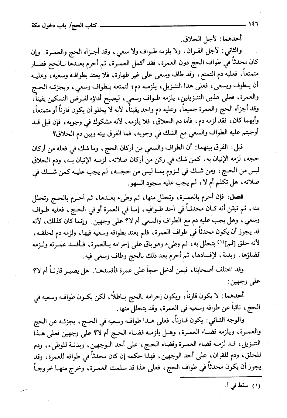 وَالثَّانِي: لِأَجْلِ الْقِرَانِ، وَلَا يَلْزَمُهُ طَوَافٌ وَلَا سَعْيٌ، وَقَدْ أَجْزَأَهُ الْحَجُّ وَالْعُمْرَةُ. وَإِنْ كَانَ مُحْدِثًا فِي طَوَافِ الْحَجِّ دُونَ الْعُمْرَةِ، فَقَدْ أَكْمَلَ الْعُمْرَةَ، ثُمَّ أَحْرَمَ بَعْدَهَا بِالْحَجِّ فَصَارَ مُتَمَتِّعًا، فَعَلَيْهِ دَمُ التَّمَتُّعِ، وَقَدْ طَافَ وَسَعَى عَلَى غَيْرِ طَهَارَةٍ، فَلَا يُعْتَدُّ بِطَوَافِهِ وَسَعْيِهِ، وَعَلَيْهِ أَنْ يَطُوفَ وَيَسْعَى، فَعَلَى هَذَا التَّنْزِيلِ، يَلْزَمُهُ دَمٌ؛ لِتَمَتُّعِهُ بِطَوَافٍ وَسَعْيٍ، وَيُجْزِئُهُ الْحَجُّ وَالْعُمْرَةُ، فَعَلَى هَذَيْنِ التَّنْزِيلَيْنِ، يَلْزَمُهُ طَوَافٌ وَسَعْيٌ، لِيُصْبِحَ أَدَاؤُهُ لِفَرْضِ النُّسُكَيْنِ يَقِينًا، وَقَدْ أَجْزَأَهُ الْحَجُّ وَالْعُمْرَةُ جَمِيعًا، وَعَلَيْهِ دَمٌ وَاحِدٌ يَقِينًا، لِأَنَّهُ لَا يَخْلُو أَنْ يَكُونَ قَارِنًا أَوْ مُتَمَتِّعًا، وَأَيُّهُمَا كَانَ، فَقَدْ لَزِمَهُ دَمٌ، فَأَمَّا دَمُ الْحِلَاقِ، فَلَا يَلْزَمُهُ، لِأَنَّهُ مَشْكُوكٌ فِي وُجُوبِهِ، فَإِنْ قِيلَ قَدْ أَوْجَبْتُمْ عَلَيْهِ الطَّوَافَ وَالسَّعْيَ مَعَ الشَّكِّ فِي وُجُوبِهِ، فَمَا الْفَرْقُ بَيْنَهُ وَبَيْنَ دَمِ الْحِلَاقِ؟