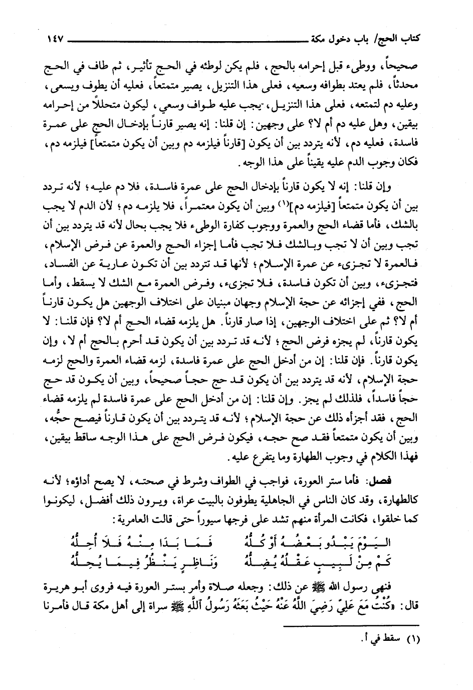 : فَأَمَّا سَتْرُ الْعَوْرَةِ، فَوَاجِبٌ فِي الطَّوَافِ وشرط في صحته، لا يصح أداؤه؛ لأنه كَالطَّهَارَةِ، وَقَدْ كَانَ النَّاسُ فِي الْجَاهِلِيَّةِ يَطُوفُونَ بِالْبَيْتِ عُرَاةً، وَيَرَوْنَ ذَلِكَ أَفْضَلَ، لِيَكُونُوا كَمَا خُلِقُوا، فَكَانَتِ الْمَرْأَةُ مِنْهُمْ تَشُدُّ عَلَى فَرْجِهَا سُيُورًا حَتَّى قَالَتِ الْعَامِرِيَّةُ:
