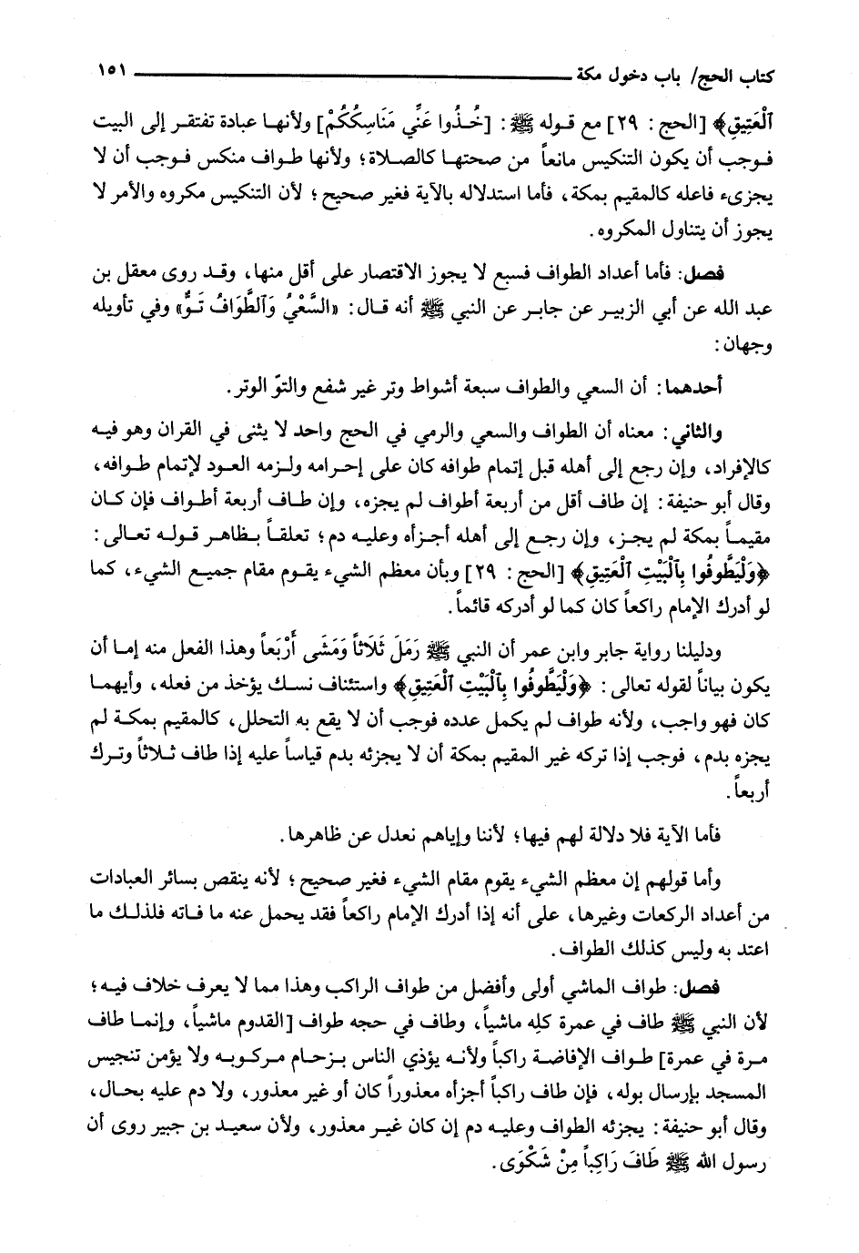الْعَتِيقِ) {الحج: 29) مَعَ قَوْلِهِ - صَلَّى اللَّهُ عَلَيْهِ وَسَلَّم َ -: " خُذُوا عَنِّي مَنَاسِكَكُمْ " وَلِأَنَّهَا عِبَادَةٌ تَفْتَقِرُ إِلَى البيت فوجب أن يكون التنكيس مانعاً مِنْ صِحَّتِهَا كَالصَّلَاةِ؛ وَلِأَنَّهَا طَوَافٌ مُنَكَّسٌ فَوَجَبَ أَنْ لَا يُجْزِئَ فَاعِلَهُ كَالْمُقِيمِ بِمَكَّةَ، فَأَمَّا اسْتِدْلَالُهُ بِالْآيَةِ فَغَيْرُ صَحِيحٍ؛ لِأَنَّ التَّنْكِيسَ مَكْرُوهٌ وَالْأَمْرُ لَا يَجُوزُ أَنْ يَتَنَاوَلَ الْمَكْرُوهَ.