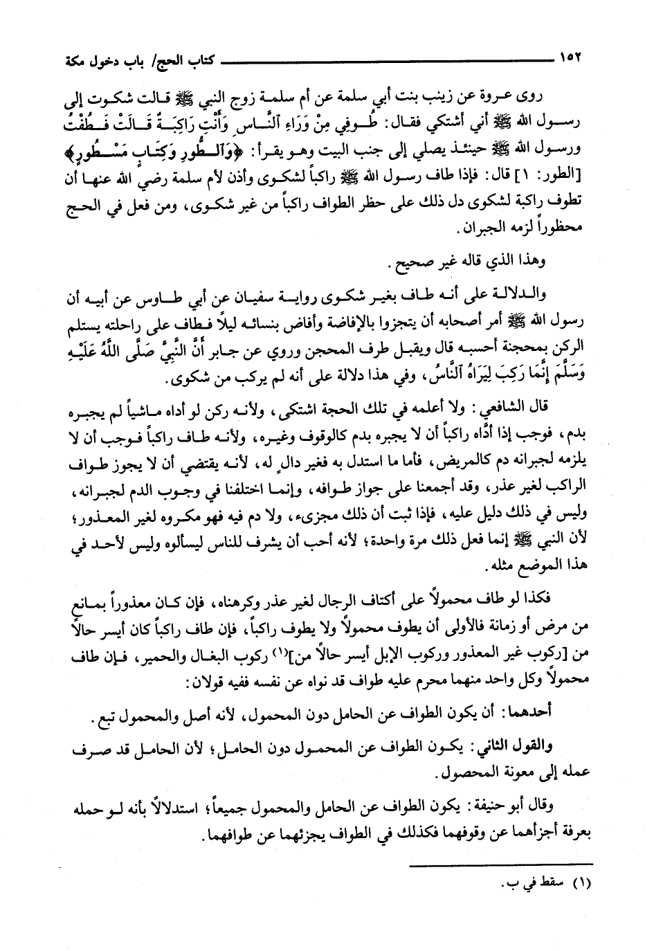 رَوَى عُرْوَةُ عَنْ زَيْنَبَ بِنْتِ أَبِي سَلَمَةَ عَنْ أُمِّ سَلَمَةَ زَوْجِ النَّبِيِّ - صَلَّى اللَّهُ عَلَيْهِ وَسَلَّم َ - قَالَتْ شَكَوْتُ إِلَى رَسُولِ اللَّهِ - صَلَّى اللَّهُ عَلَيْهِ وَسَلَّم َ - أَنِّي أَشْتَكِي فَقَالَ: طُوفِي مِنْ وَرَاءِ النَّاسِ وَأَنْتِ رَاكِبَةٌ قَالَتْ فَطُفْتُ وَرَسُولُ اللَّهِ - صَلَّى اللَّهُ عَلَيْهِ وَسَلَّم َ - حِينَئِذٍ يُصَلِّي إِلَى جَنْبِ الْبَيْتِ وَهُوَ يَقْرَأُ: {وَالطُّورِ وِكِتَابٍ مَسْطُورٍ} (الطور: 1) قَالَ: فَإِذَا طَافَ رَسُولُ اللَّهِ - صَلَّى اللَّهُ عَلَيْهِ وَسَلَّم َ - رَاكِبًا لِشَكْوَى وَأَذِنَ لِأُمِّ سَلَمَةَ رَضِيَ اللَّهُ عَنْهَا أَنْ تَطُوفَ رَاكِبَةً لِشَكْوَى دَلَّ ذَلِكَ عَلَى حَظْرِ الطَّوَافِ رَاكِبًا مِنْ غَيْرِ شَكْوَى، وَمَنْ فَعَلَ فِي الْحَجِّ مَحْظُورًا لَزِمَهُ الْجُبْرَانُ.