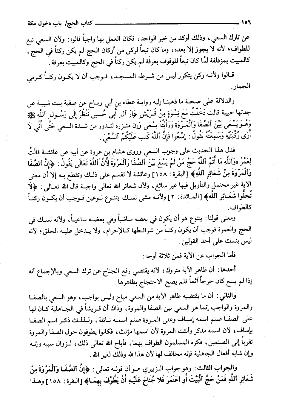 وَالثَّانِي: أَنَّ مَا يَقْتَضِيهِ ظَاهِرُ الْآيَةِ مِنَ السَّعْيِ مُبَاحٌ وَلَيْسَ بِوَاجِبٍ، وَهُوَ السَّعْيُ بِالصَّفَا وَالْمَرْوَةِ وَالْوَاجِبُ إِنَّمَا هُوَ السَّعْيُ بَيْنَ الصَّفَا وَالْمَرْوَةِ، وَذَاكَ أَنَّ قُرَيْشًا فِي الْجَاهِلِيَّةِ كَانَ لَهَا عَلَى الصَّفَا صَنَمٌ اسْمُهُ أَسَافُ وَعَلَى الْمَرْوَةِ صَنَمٌ اسْمُهُ نَائِلَةُ، وَلِذَلِكَ ذَكَرَ اسْمَ الصَّفَا بِإِسَافَ، لِأَنَّ اسْمَهُ مُذَكَّرٌ وَأُنِّثَتِ الْمَرْوَةُ لِأَنَّ اسْمَهَا مُؤَنَّثٌ، فَكَانُوا يَطُوفُونَ حَوْلَ الصَّفَا وَالْمَرْوَةِ تَقَرُّبًا إِلَى الصَّنَمَيْنِ، فَكَرِهَ الْمُسْلِمُونَ الطَّوَافَ بِهِمَا، فَأَبَاحَ اللَّهُ تَعَالَى ذَلِكَ، لِزَوَالِ سَبَبِهِ وَإِنَّهُ وَإِنْ شَابَهَ أَفْعَالَ الْجَاهِلِيَّةِ فَإِنَّهُ مُخَالِفٌ لَهَا لِأَنَّ هَذَا لِلَّهِ وَذَلِكَ لِغَيْرِ اللَّهِ.