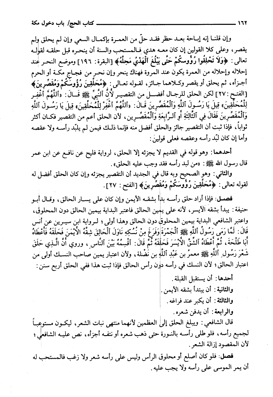 أَحَدُهُمَا: وَهُوَ قَوْلُهُ فِي الْقَدِيمِ لَا يُجْزِئُهُ إِلَّا الْحَلْقُ، لِرِوَايَةِ فُلَيْحٍ عَنْ نَافِعٍ عَنِ ابْنِ عُمَرَ قَالَ رَسُولُ اللَّهِ - صَلَّى اللَّهُ عَلَيْهِ وَسَلَّم َ -: " مَنْ لَبَّدَ رَأْسَهُ فَقَدْ وَجَبَ عَلَيْهِ الْحَلْقُ ".