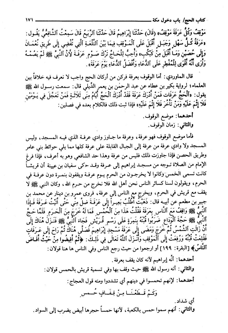 قَالَ الْمَاوَرْدِيُّ: أَمَّا الْوُقُوفُ بِعَرَفَةَ فَرُكْنٌ مِنْ أَرْكَانِ الْحَجِّ وَاجِبٌ لَا نَعْرِفُ فِيهِ خِلَافًا بَيْنَ الْعُلَمَاءِ؛ لِرِوَايَةِ بُكَيْرِ بْنِ عَطَاءٍ عَنْ عَبْدِ الرَّحْمَنِ بْنِ يَعْمَرَ الدِّيلِيِّ قَالَ: سَمِعْتُ رَسُولَ اللَّهِ - صَلَّى اللَّهُ عَلَيْهِ وَسَلَّم َ - يَقُولُ: " الْحَجُّ عَرَفَاتٌ فَمَنْ أَدْرَكَ عَرَفَةَ فَقَدْ أدرك الحج أيام منى ثلاثةٍ فمن تعجل في يومين فلا إثم عليه ومن تأخر فَلَا إِثْمَ عَلَيْهِ " فَإِذَا ثَبَتَ ذَلِكَ فَالْكَلَامُ بَعْدَهُ فِي فَصْلَيْنِ:
