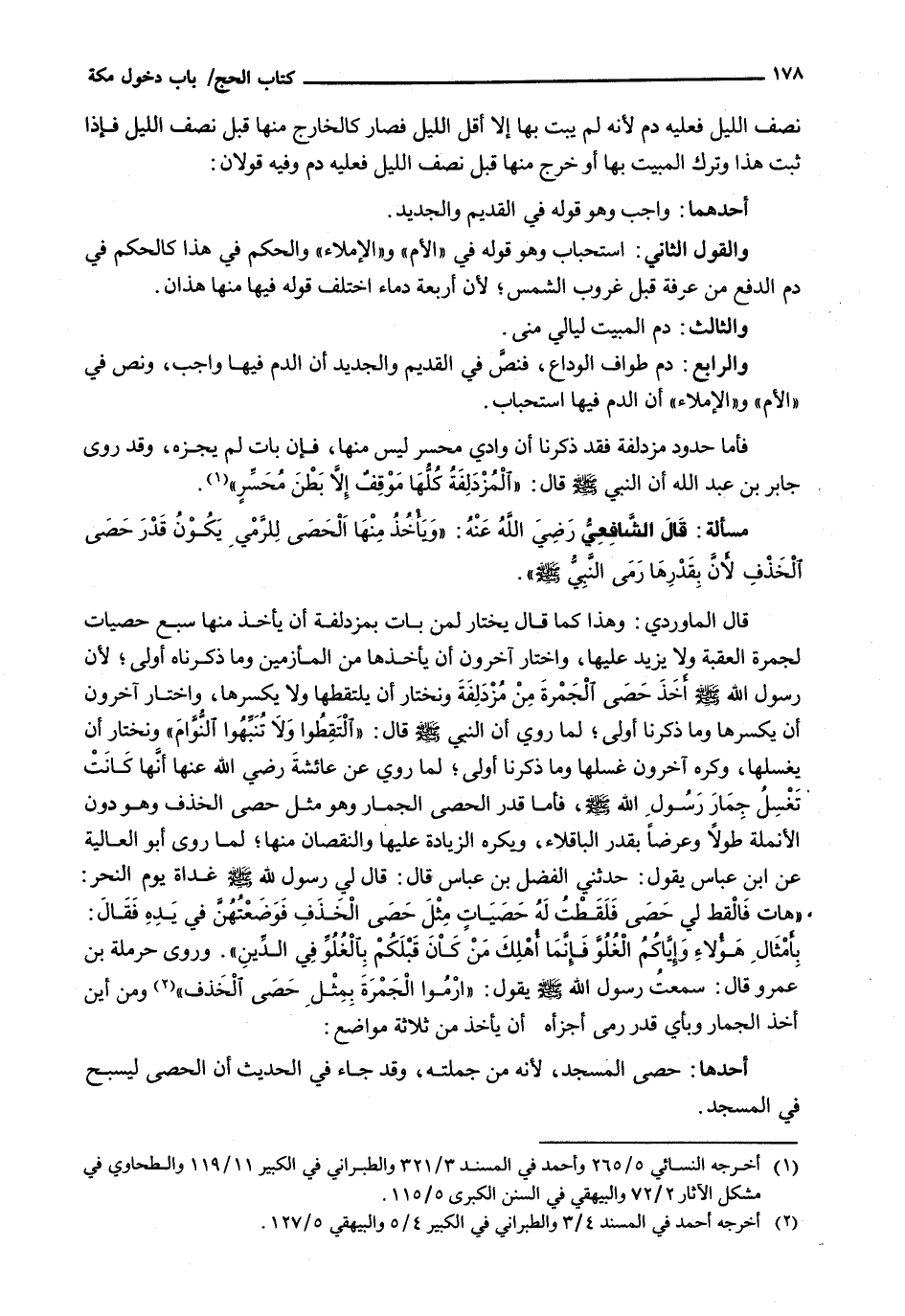 قَالَ الْمَاوَرْدِيُّ: وَهَذَا كَمَا قَالَ يُخْتَارُ لِمَنْ بَاتَ بِمُزْدَلِفَةَ أَنْ يَأْخُذَ مِنْهَا سَبْعَ حَصَيَاتٍ لِجَمْرَةِ الْعَقَبَةِ وَلَا يَزِيدُ عَلَيْهَا، وَاخْتَارَ آخَرُونَ أَنْ يَأْخُذَهَا مِنَ الْمَأْزِمَيْنِ وَمَا ذَكَرْنَاهُ أَوْلَى؛ لِأَنَّ رَسُولَ اللَّهِ - صَلَّى اللَّهُ عَلَيْهِ وَسَلَّم َ - أخذ حصى الجمرة من مزدلفة ونختار أَنْ يَلْتَقِطَهَا وَلَا يَكْسِرَهَا، وَاخْتَارَ آخَرُونَ أَنْ يَكْسِرَهَا وَمَا ذَكَرْنَا أَوْلَى؛ لِمَا رُوِيَ أَنَّ النَّبِيَّ - صَلَّى اللَّهُ عَلَيْهِ وَسَلَّم َ - قَالَ: " الْتَقِطُوا وَلَا تُنَبِّهُوا النُّوَّامَ " وَنَخْتَارُ أَنْ يَغْسِلَهَا، وَكَرِهَ آخَرُونَ غَسْلَهَا وَمَا ذَكَرْنَا أَوْلَى؛ لِمَا رُوِيَ عَنْ عَائِشَةَ رَضِيَ اللَّهُ عَنْهَا أَنَّهَا كَانَتْ تَغْسِلُ جِمَارَ رَسُولِ اللَّهِ - صَلَّى اللَّهُ عَلَيْهِ وَسَلَّم َ -، فَأَمَّا قَدْرُ الْحَصَى الْجِمَارِ وَهُوَ مِثْلُ حَصَى الْخَذْفِ وَهُوَ دُونَ الْأُنْمُلَةِ طُولًا وَعَرْضًا بِقَدْرِ الْبَاقِلَّاءِ، وَيُكْرَهُ الزِّيَادَةُ عَلَيْهَا وَالنُّقْصَانُ مِنْهَا؛ لِمَا رَوَى أَبُو الْعَالِيَةِ عَنِ ابْنِ عَبَّاسٍ يَقُولُ: حَدَّثَنِي الْفَضْلُ بْنُ عَبَّاسٍ قَالَ: قَالَ لِي رَسُولُ اللَّهِ - صَلَّى اللَّهُ عَلَيْهِ وَسَلَّم َ - غَدَاةَ يَوْمِ النَّحْرِ: " هَاتِ فَالْقِطْ لِي حَصًى فَلَقَطْتُ لَهُ حَصَيَاتٍ مِثْلَ حَصَى الْخَذَفِ فَوَضَعْتُهُنَ في يده فقال: بأمثال هؤلاء وإياكم الغلو فَإِنَّمَا أُهْلِكَ مَنْ كَاْنَ قَبْلَكُمْ بِالْغُلُوِّ فِي الدِّينِ ". وَرَوَى حَرْمَلَةُ بْنُ عَمْرٍو قَالَ: سَمِعْتُ رَسُولَ اللَّهِ - صَلَّى اللَّهُ عَلَيْهِ وَسَلَّم َ - يَقُولُ: " ارْمُوا الْجَمْرَةَ بِمِثْلِ حَصَى الْخَذْفِ " وَمِنْ أَيْنَ أَخَذَ الْجِمَارَ وَبِأَيِّ قَدَرٍ رَمَى أَجْزَأَهُ أَنْ يَأْخُذَ مِنْ ثَلَاثَةِ مَوَاضِعَ: