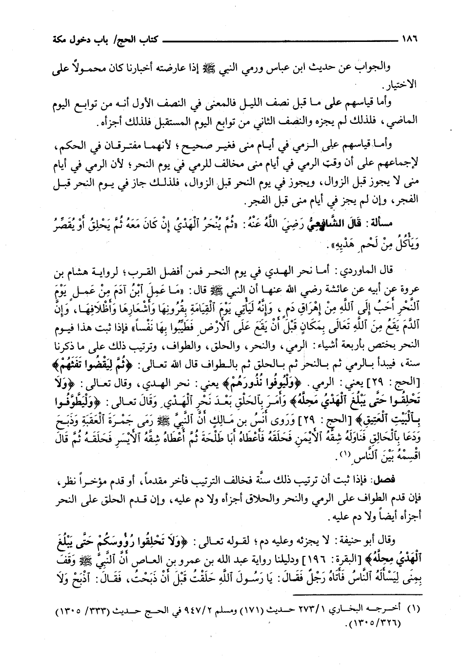 قَالَ الْمَاوَرْدِيُّ: أَمَّا نَحْرُ الْهَدْيِ فِي يَوْمِ النَّحْرِ فَمِنْ أَفْضَلِ الْقُرَبِ؛ لِرِوَايَةِ هِشَامِ بْنِ عُرْوَةَ عَنْ أَبِيهِ عَنْ عَائِشَةَ رَضِيَ اللَّهُ عَنْهَا أَنَّ النَّبِيَّ - صَلَّى اللَّهُ عَلَيْهِ وَسَلَّم َ - قَالَ: " مَا عَمِلَ ابْنُ آدَمَ مِنْ عملٍ يَوْمَ النَّحْرِ أَحَبَّ إِلَى اللَّهِ مِنْ إِهْرَاقِ دمٍ، وإنه ليأتي يَوْمَ الْقِيَامَةِ بِقُرُونِهَا وَأَشْعَارِهَا وَأَظْلَافِهَا، وَإِنَّ الدَّمَ يقع في اللَّهِ تَعَالَى بمكانٍ قَبْلَ أَنْ يَقَعَ عَلَى الْأَرْضِ فَطِيبُوا بِهَا نَفْسًا " فَإِذَا ثَبَتَ هَذَا فَيَوْمُ النَّحْرِ يَخْتَصُّ بِأَرْبَعَةِ أَشْيَاءَ: الرَّمْيُ، وَالنَّحْرُ، وَالْحَلْقُ، وَالطَّوَافُ، وَتَرْتِيبُ ذَلِكَ عَلَى مَا ذَكَرْنَا سُنَّةٌ، فَيَبْدَأُ بِالرَّمْيِ ثُمَّ بِالنَّحْرِ ثُمَّ بِالْحَلْقِ ثُمَّ بِالطَّوَافِ قَالَ اللَّهُ تَعَالَى: {ثُمَّ لَيَقْضُواْ تَفَثَهُمْ} (الحج: 29) يعني: الرمي. {وَلْيُوفُوا نُذُرَهُمْ} يَعْنِي: نَحَرَ الْهَدْيِ، وَقَالَ تَعَالَى: {وَلاَ تَحْلِقُوا حَتَّى يَبْلُغَ الهَدْيُ مَحِلَّهُ} وَأَمَرَ بِالْحَلْقِ بَعْدَ نَحْرِ الْهَدْيِ وَقَالَ تَعَالَى: {وَلْيَطَّوَّفُوا بِالْبَيْتِ الْعَتِيقِ) {الحج: 29) وَرَوَى أَنَسِ بْنِ مَالِكٍ أَنَّ النَّبِيَّ - صَلَّى اللَّهُ عَلَيْهِ وَسَلَّم َ - رَمَى جَمْرَةَ الْعَقَبَةِ وَذَبَحَ وَدَعَا بِالْحَالِقِ فَنَاوَلَهُ شِقَّهُ الْأَيْمَنَ فَحَلَقَهُ فَأَعْطَاهُ أَبَا طَلْحَةَ ثُمَّ أَعْطَاهُ شِقَّهُ الْأَيْسَرَ فَحَلَقَهُ ثُمَّ قَالَ اقْسِمْهُ بَيْنَ النَّاسِ.