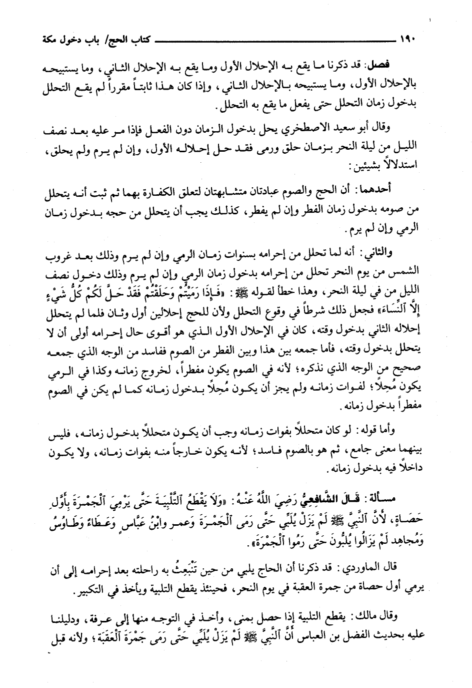 وَالثَّانِي: أَنَّهُ لما تحلل من إحرامه بسنوات زَمَانِ الرَّمْيِ وَإِنْ لَمْ يَرْمِ وَذَلِكَ بَعْدَ غُرُوبِ الشَّمْسِ مِنْ يَوْمِ النَّحْرِ تَحَلَّلَ مِنْ إِحْرَامِهِ بِدُخُولِ زَمَانِ الرَّمْيِ وَإِنْ لَمْ يَرْمِ وذلك دخول نصف الليل من في لَيْلَةِ النَّحْرِ، وَهَذَا خَطَأٌ لِقَوْلِهِ - صَلَّى اللَّهُ عَلَيْهِ وَسَلَّم َ -: " فإذا رميتم وحلقتم فقد حل لكم كل شَيْءٍ إِلَّا النِّسَاءَ " فَجَعَلَ ذَلِكَ شَرْطًا فِي وُقُوعِ التَّحَلُّلِ وَلِأَنَّ لِلْحَجِّ إِحْلَالَيْنِ أَوَّلٌ وَثَانٍ فَلَمَّا لَمْ يَتَحَلَّلْ إِحْلَالَهُ الثَّانِيَ بِدُخُولِ وَقْتِهِ، كَانَ فِي الْإِحْلَالِ الْأَوَّلِ الَّذِي هُوَ أَقْوَى حَالَ إِحْرَامِهِ أَوْلَى أَنْ لَا يَتَحَلَّلَ بِدُخُولِ وَقْتِهِ، فَأَمَّا جَمْعُهُ بَيْنَ هَذَا وَبَيْنَ الْفِطْرِ مِنَ الصَّوْمِ فَفَاسِدٌ مِنَ الْوَجْهِ الَّذِي جَمْعُهُ صَحِيحٌ مِنَ الْوَجْهِ الَّذِي نَذْكُرُهُ؛ لِأَنَّهُ فِي الصَّوْمِ يَكُونُ مُفْطِرًا، لِخُرُوجِ زَمَانِهِ وَكَذَا فِي الرَّمْيِ يَكُونُ مُحِلًّا؛ لِفَوَاتِ زَمَانِهِ وَلَمْ يَجُزْ أَنْ يَكُونَ مُحِلًّا بِدُخُولِ زَمَانِهِ كَمَا لَمْ يَكُنْ فِي الصَّوْمِ مُفْطِرًا بِدُخُولِ زَمَانِهِ.