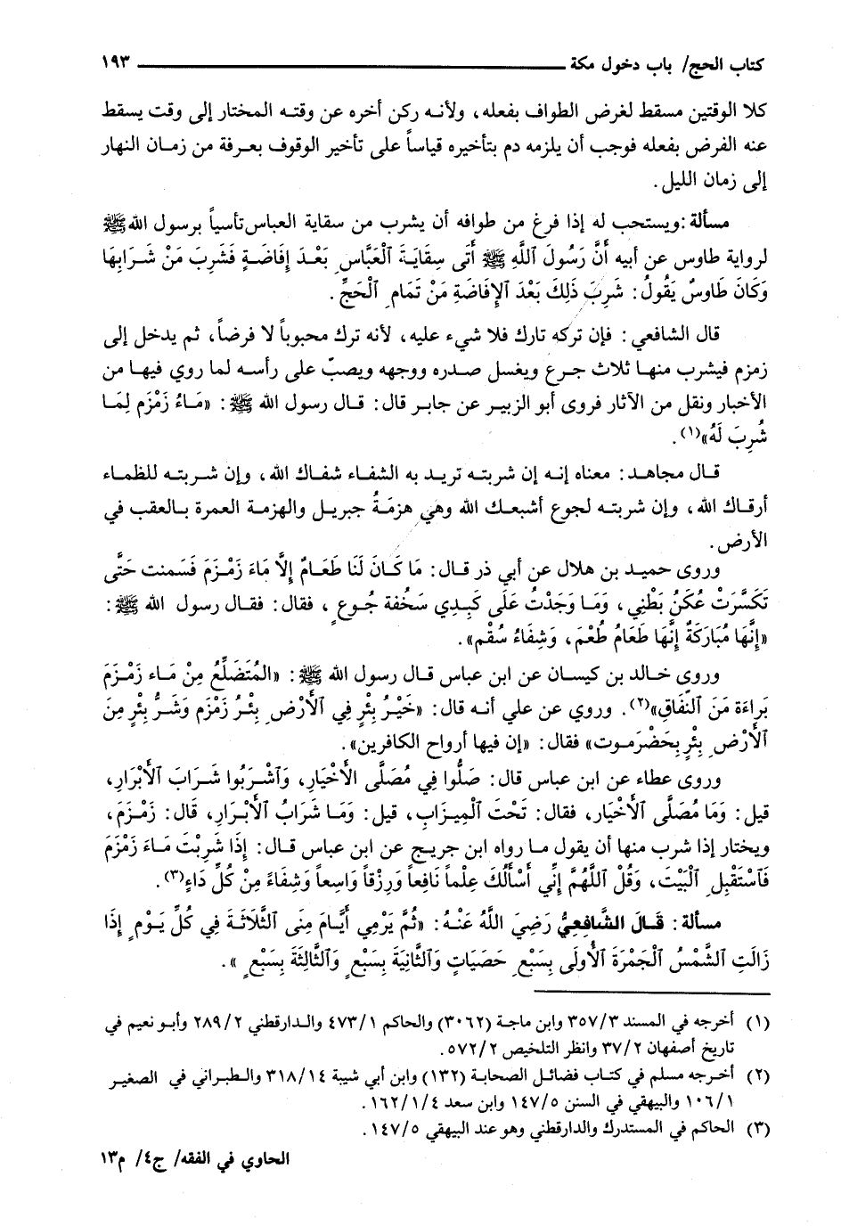 قَالَ الشَّافِعِيُّ: فَإِنَّ تَرْكَهُ تَارِكٌ فَلَا شَيْءَ عَلَيْهِ، لِأَنَّهُ تَرَكَ مَحْبُوبًا لَا فَرْضًا، ثُمَّ يَدْخُلُ إِلَى زَمْزَمَ فَيَشْرَبُ مِنْهَا ثَلَاثَ جُرَعٍ وَيَغْسِلُ صَدْرَهُ وَوَجْهَهُ وَيَصُبُّ عَلَى رَأْسِهِ لِمَا رُوِيَ فِيهَا مِنَ الْأَخْبَارِ وَنُقِلَ مِنَ الْآثَارِ فَرَوَى أَبُو الزُّبَيْرِ عَنْ جَابِرٍ قَالَ: قَالَ رَسُولُ اللَّهِ - صَلَّى اللَّهُ عَلَيْهِ وَسَلَّم َ - " مَاءُ زَمْزَمَ لِمَا شُرِبَ لَهُ ".