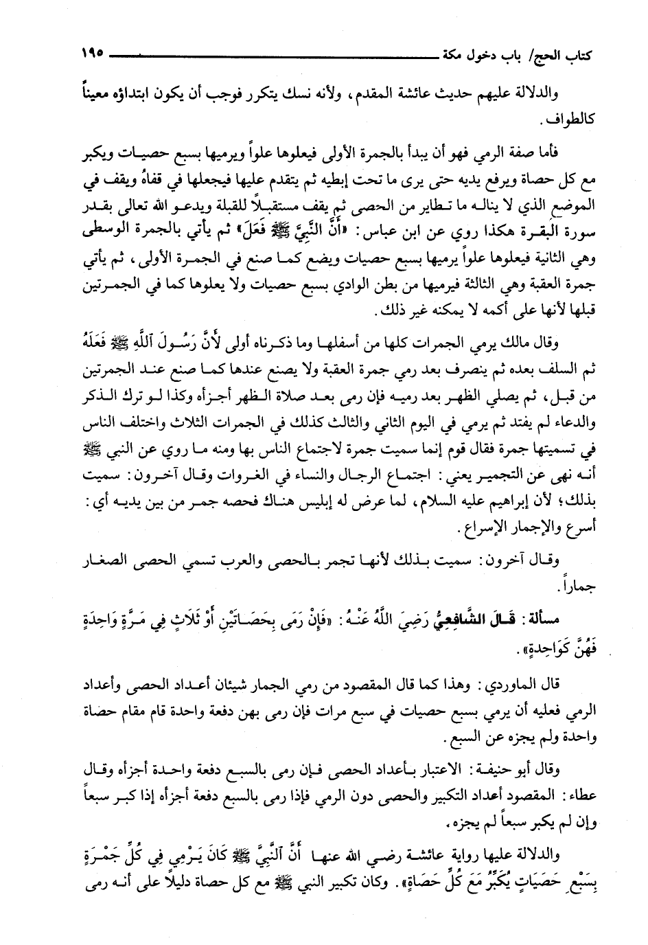 فَأَمَّا صِفَةُ الرَّمْيِ فَهُوَ أَنْ يَبْدَأَ بِالْجَمْرَةِ الْأُولَى، فَيَعْلُوهَا عُلُوًّا وَيَرْمِيهَا بِسَبْعِ حَصَيَاتٍ وَيُكَبِّرُ مَعَ كُلِّ حَصَاةٍ وَيَرْفَعُ يَدَيْهِ حتى يرى مَا تَحْتَ إِبِطَيْهِ ثُمَّ يَتَقَدَّمُ عَلَيْهَا فَيَجْعَلُهَا في قفاه ويقف في الموضع الَّذِي لَا يَنَالُهُ مَا تَطَايَرَ مِنَ الْحَصَى ثُمَّ يَقِفُ مُسْتَقْبِلًا لِلْقِبْلَةِ وَيَدْعُو اللَّهَ تَعَالَى بِقَدْرِ سُورَةِ الْبَقَرَةِ هَكَذَا رُوِيَ عَنِ ابْنِ عَبَّاسٍ: " أَنَّ النَّبِيَّ - صَلَّى اللَّهُ عَلَيْهِ وَسَلَّم َ - فَعَلَ " ثُمَّ يَأْتِي بِالْجَمْرَةِ الْوُسْطَى وَهِيَ الثَّانِيَةُ فيعلوها علواً يرميها بسبع حصيات ويضع كَمَا صَنَعَ فِي الْجَمْرَةِ الْأُولَى، ثُمَّ يَأْتِي جَمْرَةَ الْعَقَبَةِ وَهِيَ الثَّالِثَةُ فَيَرْمِيهَا مِنْ بَطْنِ الْوَادِي بِسَبْعِ حَصَيَاتٍ وَلَا يَعْلُوهَا كَمَا فِي الجمرتين قبلها لأنها على أكمه لَا يُمْكِنُهُ غَيْرُ ذَلِكَ.