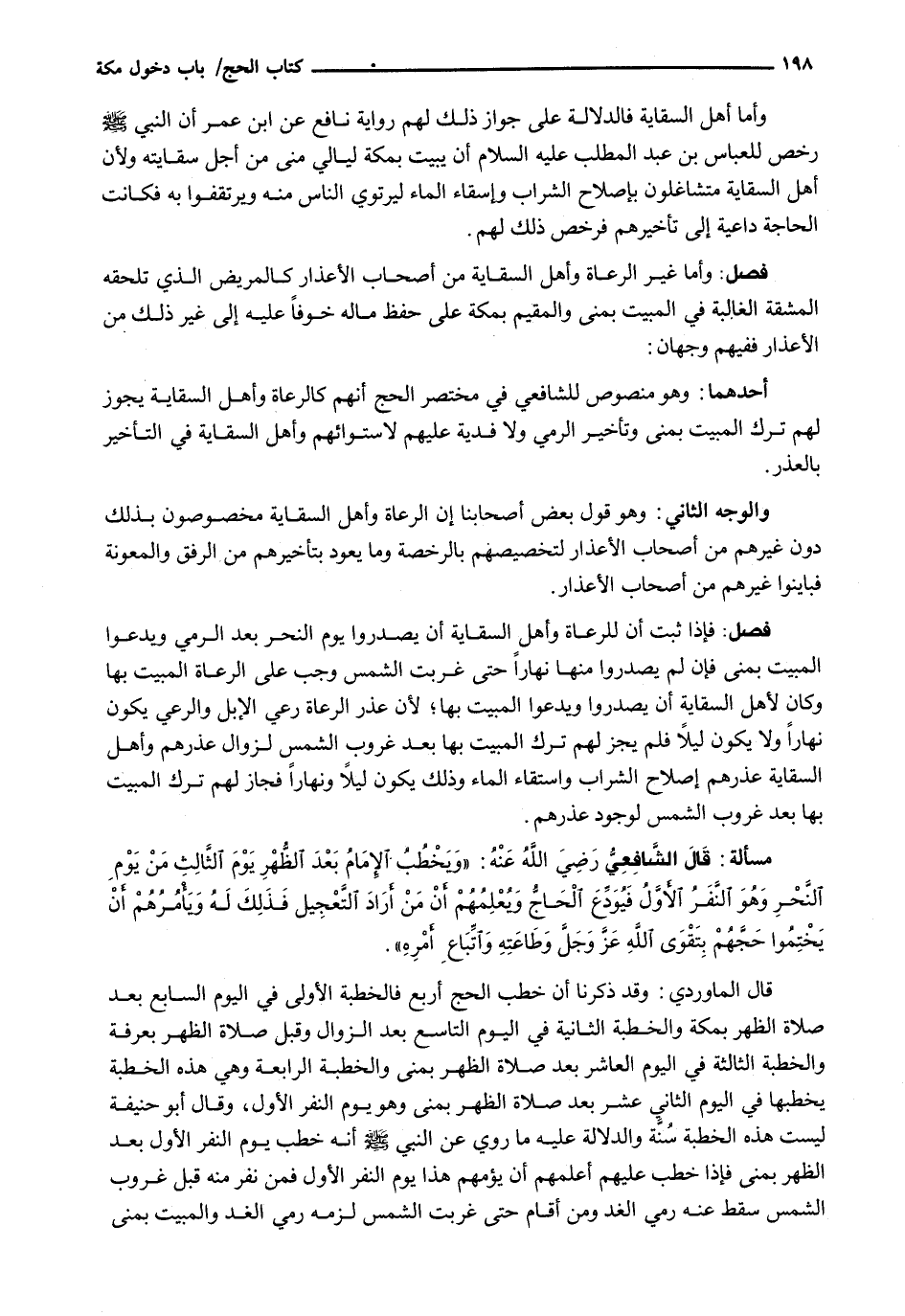 : فَإِذَا ثبت لِلرُّعَاةِ وَأَهِلِ السِّقَايَةِ أَنْ يَصْدُرُوا يَوْمَ النَّحْرِ بَعْدَ الرَّمْيِ وَيَدَعُوا الْمَبِيتَ بِمِنًى فَإِنْ لَمْ يَصْدُرُوا مِنْهَا نَهَارًا حَتَّى غَرَبَتِ الشَّمْسُ وَجَبَ عَلَى الرُّعَاةِ الْمَبِيتُ بِهَا وَكَانَ لِأَهْلِ السِّقَايَةِ أَنْ يَصْدُرُوا وَيَدَعُوا الْمَبِيتَ بِهَا؛ لِأَنَّ عُذْرَ الرُّعَاةِ رَعْيُ الْإِبِلِ وَالرَّعْيُ يَكُونُ نَهَارًا وَلَا يَكُونُ لَيْلًا فَلَمْ يَجُزْ لَهُمْ تَرْكُ الْمَبِيتِ بِهَا بَعْدَ غُرُوبِ الشَّمْسِ لِزَوَالِ عُذْرِهِمْ وَأَهْلُ السِّقَايَةِ عُذْرُهُمْ إِصْلَاحُ الشَّرَابِ وَاسْتِقَاءُ الْمَاءِ وَذَلِكَ يَكُونُ لَيْلًا وَنَهَارًا فَجَازَ لَهُمْ تَرْكُ الْمَبِيتِ بِهَا بَعْدَ غُرُوبِ الشَّمْسِ لِوُجُودِ عُذْرِهِمْ.
