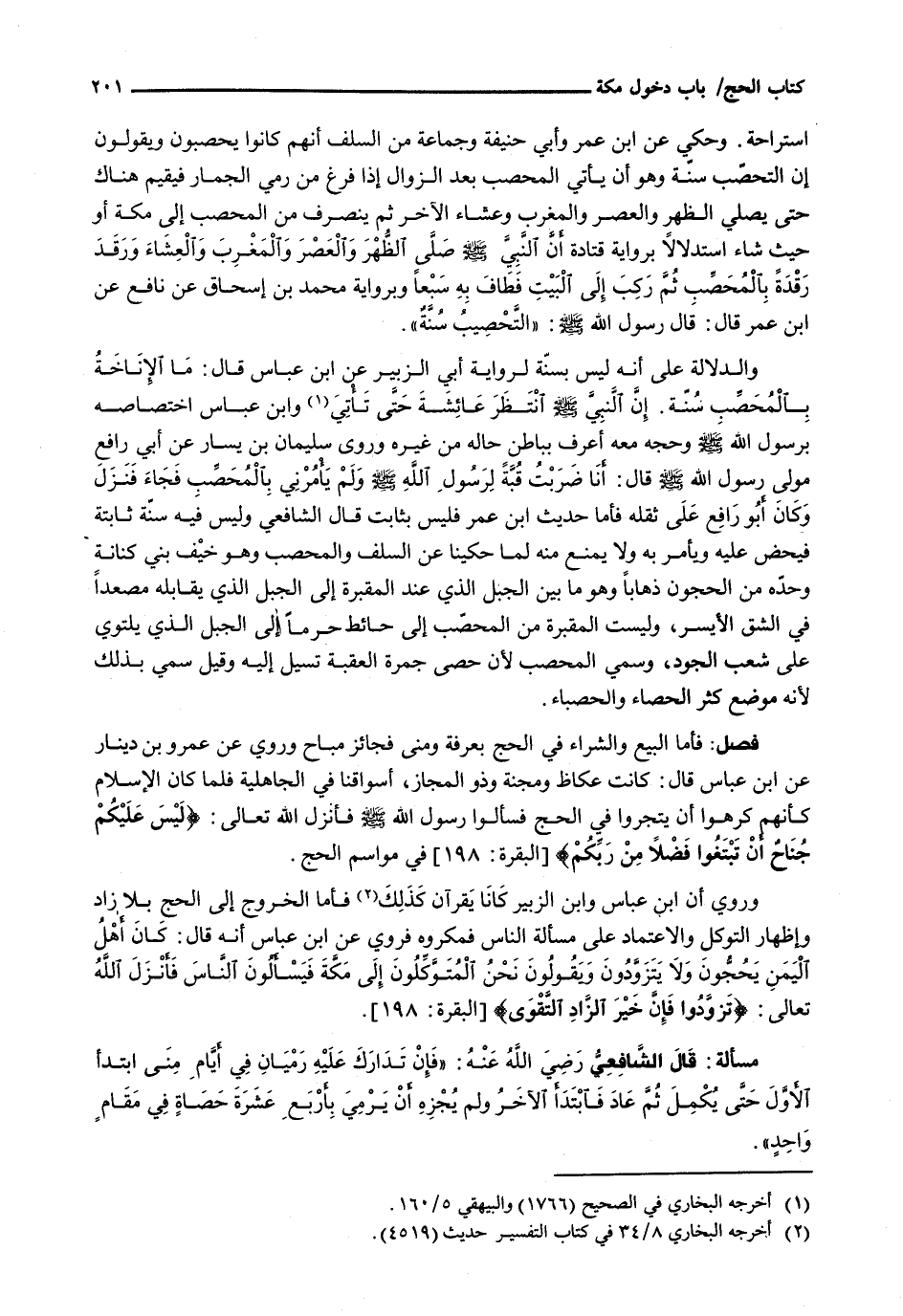 وَالدَّلَالَةُ عَلَى أَنَّهُ لَيْسَ بِسُنَّةٍ لرواية أَبِي الزُّبَيْرِ عَنِ ابْنِ عَبَّاسٍ قَالَ: مَا الْإِنَاخَةُ بِالْمُحَصَّبِ سُنَّةٌ. إِنَّ النَّبِيَّ - صَلَّى اللَّهُ عَلَيْهِ وَسَلَّم َ - انتظر عائشة حتى تأتي وابن عباس اخْتِصَاصِهِ بِرَسُولِ اللَّهِ - صَلَّى اللَّهُ عَلَيْهِ وَسَلَّم َ - وَحَجِّهِ مَعَهُ أَعْرَفُ بِبَاطِنِ حَالِهِ مِنْ غَيْرِهِ وَرَوَى سُلَيْمَانُ بْنُ يَسَارٍ عَنْ أَبِي رَافِعٍ مَوْلَى رَسُولِ اللَّهِ - صَلَّى اللَّهُ عَلَيْهِ وَسَلَّم َ - قَالَ: أَنَا ضَرَبْتُ قُبَّةً لِرَسُولِ اللَّهِ - صَلَّى اللَّهُ عَلَيْهِ وَسَلَّم َ - وَلَمْ يَأْمُرْنِي بِالْمُحَصَّبِ فَجَاءَ فَنَزَلَ وَكَانَ أَبُو رَافِعٍ عَلَى ثِقْلِهِ فَأَمَّا حَدِيثُ ابْنِ عُمَرَ فَلَيْسَ بِثَابِتٍ قَالَ الشَّافِعِيُّ وَلَيْسَ فِيهِ سُنَّةٌ ثَابِتَةٌ فَيَحُضُّ عَلَيْهِ وَيَأْمُرُ بِهِ وَلَا يَمْنَعُ مِنْهُ لِمَا حَكَيْنَا عَنِ السَّلَفِ وَالْمُحَصَّبُ وَهُوَ خيف بني كنانة وحده من الحجون ذهاباً وهو ما بين الجبل الذي عند المقبرة إلى الجبل الذي يقابله مصعداً في الشق الأيسر، وَلَيْسَتِ الْمَقْبَرَةُ مِنَ الْمُحَصَّبِ إِلَى حَائِطٍ حَرَمًا إِلَى الْجَبَلِ الَّذِي يَلْتَوِي عَلَى شِعْبِ الْجُودِ، وسمي المحصب لأنه حصى جمرة العقبة تسيل إليه وقيل سمي بذلك لأنه موضع كثير الحصاء والحصباء.