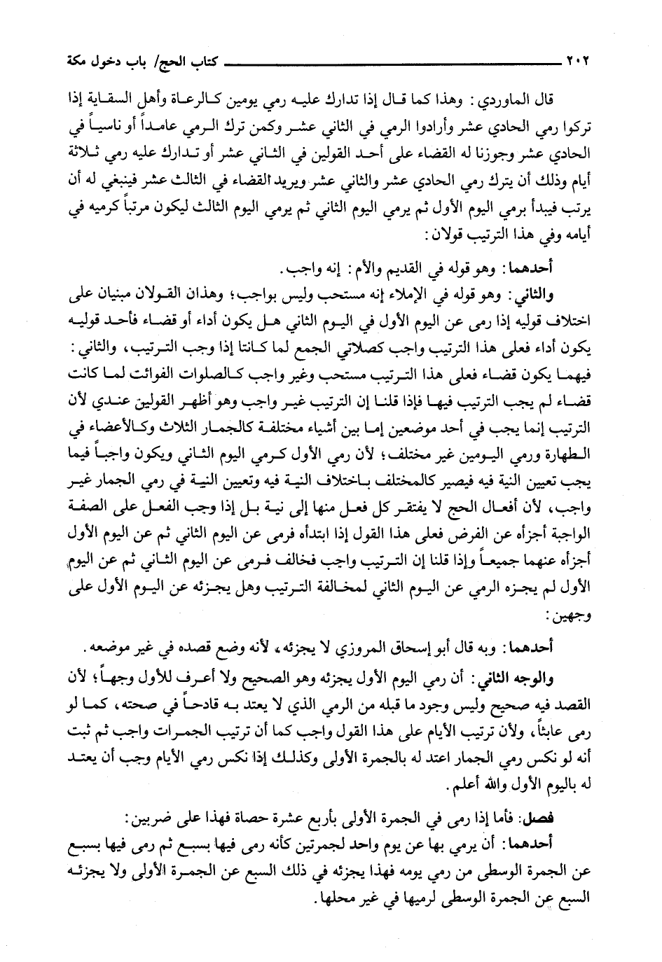 قَالَ الْمَاوَرْدِيُّ: وَهَذَا كَمَا قَالَ إِذَا تَدَارَكَ عَلَيْهِ رَمْيُ يَوْمَيْنِ كَالرُّعَاةِ وَأَهْلِ السِّقَايَةِ إِذَا تَرَكُوا رَمْيَ الْحَادِيَ عَشَرَ وَأَرَادُوا الرَّمْيَ فِي الثَّانِيَ عَشَرَ وَكَمَنَ تَرَكَ الرَّمْيَ عَامِدًا أَوْ نَاسِيًا فِي الْحَادِيَ عَشَرَ وَجَوَّزْنَا لَهُ الْقَضَاءَ عَلَى أَحَدِ الْقَوْلَيْنِ فِي الثَّانِيَ عَشَرَ أَوْ تَدَارَكَ عَلَيْهِ رَمْيُ ثَلَاثَةِ أَيَّامٍ وَذَلِكَ أَنْ يَتْرُكَ رَمْيَ الْحَادِيَ عَشَرَ وَالثَّانِيَ عَشَرَ وَيُرِيدُ الْقَضَاءَ فِي الثَّالِثَ عَشَرَ فَيَنْبَغِي لَهُ أَنْ يُرَتِّبَ فَيَبْدَأَ بِرَمْيِ الْيَوْمِ الْأَوَّلِ ثُمَّ يَرْمِي الْيَوْمَ الثَّانِيَ ثُمَّ يَرْمِي الْيَوْمَ الثَّالِثَ لِيَكُونَ مُرَتَّبًا كَرَمْيِهِ فِي أَيَّامِهِ وَفِي هَذَا التَّرْتِيبِ قَوْلَانِ: