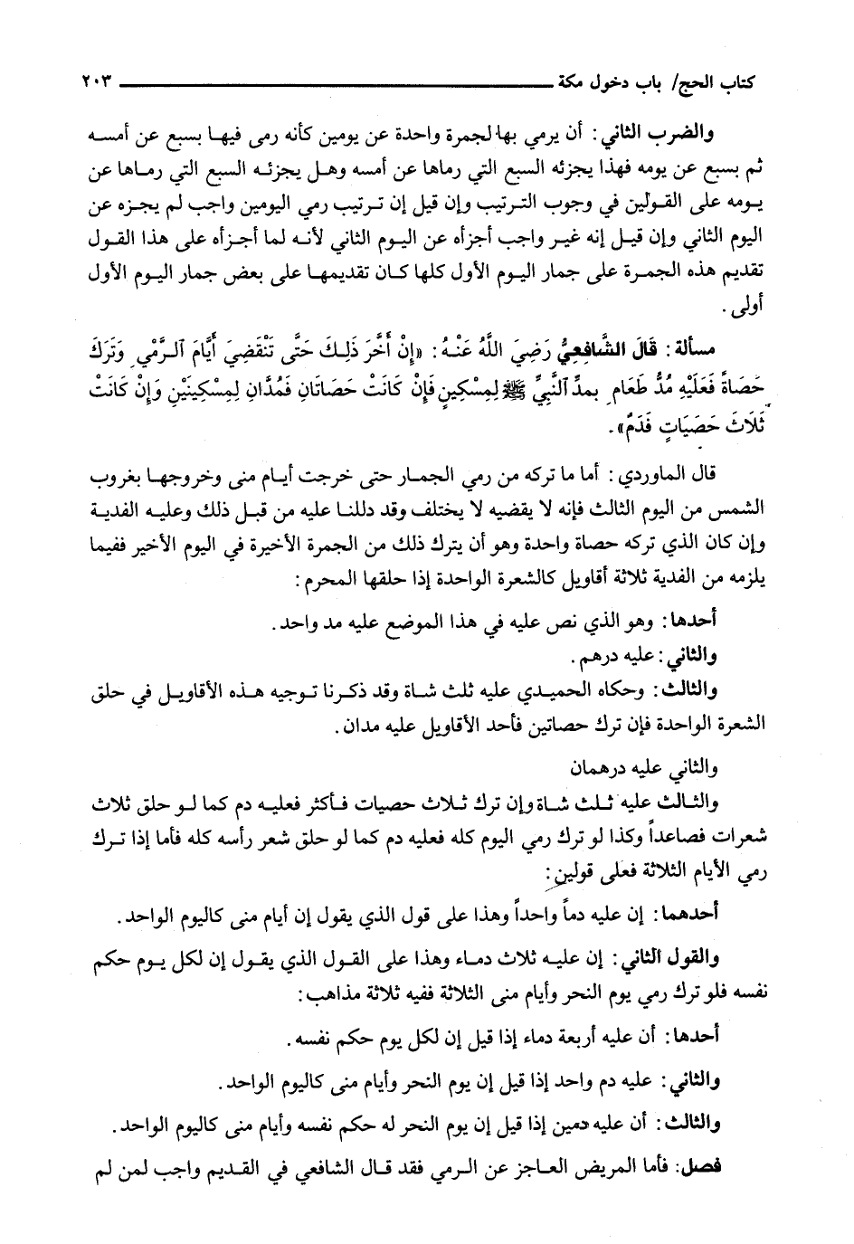 مَسْأَلَةٌ: قال الشافعي رضي الله عنه: " إن أَخَّرَ ذَلِكَ حَتَى تَنْقَضِيَ أَيَّامُ الرَّمْيِ وَتَرَكَ حَصَاةً فَعَلَيْهِ مُدُّ طَعَامٍ بِمُدِّ النَّبِيِّ - صَلَّى اللَّهُ عَلَيْهِ وَسَلَّم َ - لمسكين فإن كانت حصاتان فمدان لمسكينين وإن كانت ثَلَاثَ حصياتٍ فدمٌ ".