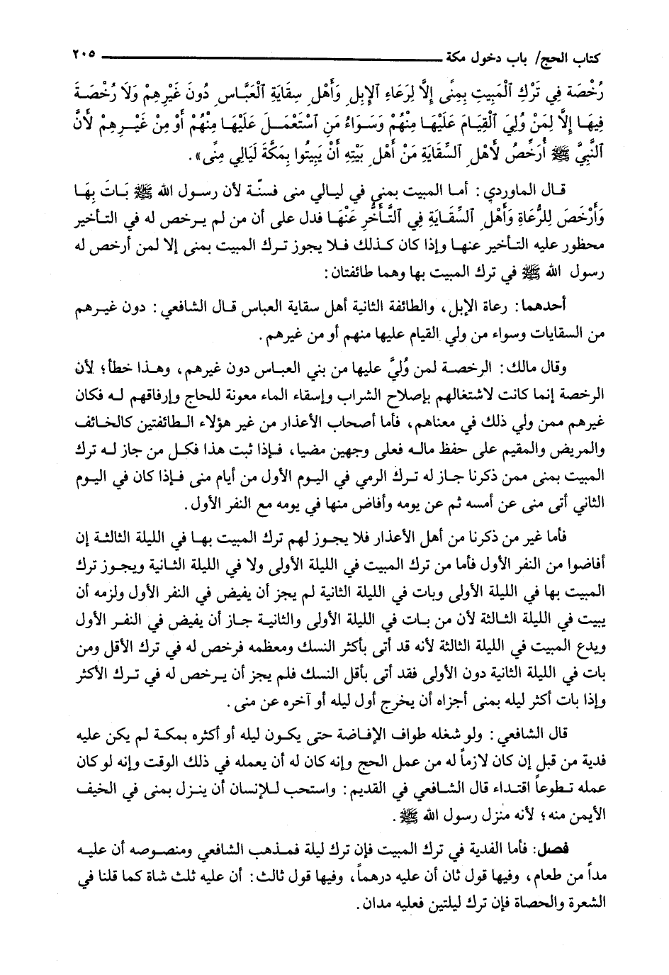 رُخْصَةَ فِي تَرْكِ الْمَبِيتِ بِمِنًى إِلَّا لِرَعَاءِ الإبل وأهل سقاية العباس دون غيرهم ولا رخصة فيها إلا لمن ولي القيام عليها منهم وسواء من استعمل عليها منهم أو من غيرهم لأن النبي - صَلَّى اللَّهُ عَلَيْهِ وَسَلَّم َ - أرخص لأهل السقاية من أهل بيته أن يبيتوا بمكة ليالي منىً ".