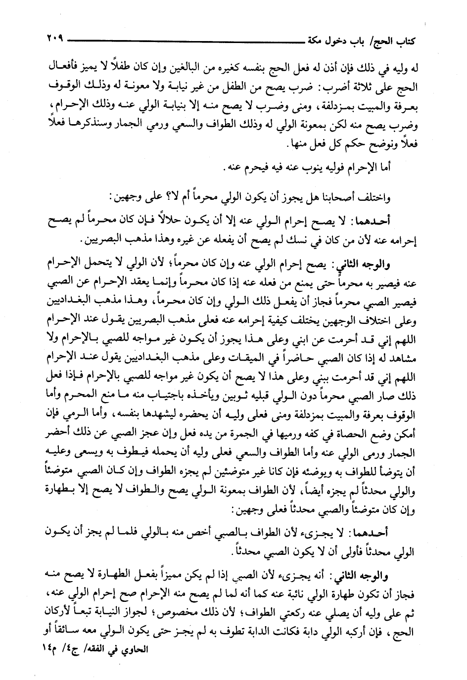 وَالْوَجْهُ الثَّانِي: يَصِحُّ إِحْرَامُ الْوَلِيِّ عَنْهُ وإن كان محرماً؛ لأن الولي لا يتحمل الإحرام عنه فَيَصِيرُ بِهِ مُحْرِمًا حَتَّى يُمْنَعَ مِنْ فِعْلِهِ عَنْهُ إِذَا كَانَ مُحْرِمًا وَإِنَّمَا يَعْقِدُ الْإِحْرَامَ عَنِ الصَّبِيِّ فَيَصِيرُ الصَّبِيُّ مُحْرِمًا فَجَازَ أَنْ يَفْعَلَ ذَلِكَ الْوَلِيُّ وَإِنْ كَانَ مُحْرِمًا، وَهَذَا مذهب البغداديين وعلى اختلاف الْوَجْهَيْنِ يَخْتَلِفُ كَيْفِيَّةُ إِحْرَامِهِ عَنْهُ فَعَلَى مَذْهَبِ الْبَصْرِيِّينَ يَقُولُ عِنْدَ الْإِحْرَامِ اللَّهُمَّ إِنِّي قَدْ أَحْرَمْتُ عَنِ ابْنِي وَعَلَى هَذَا يَجُوزُ أَنْ يَكُونَ غَيْرَ مُوَاجِهٍ لِلصَّبِيِّ بِالْإِحْرَامِ وَلَا مُشَاهِدٍ لَهُ إِذَا كَانَ الصَّبِيُّ حَاضِرًا فِي الْمِيقَاتِ وَعَلَى مَذْهَبِ الْبَغْدَادِيِّينَ يَقُولُ عِنْدَ الْإِحْرَامِ اللَّهُمَّ إني قد أحرمت ببني وَعَلَى هَذَا لَا يَصِحُّ أَنْ يَكُونَ غَيْرَ مُوَاجِهٍ لِلصَّبِيِّ بِالْإِحْرَامِ فَإِذَا فَعَلَ ذَلِكَ صَارَ الصبي محرماً دون الولي قبليه ثَوْبَيْنِ وَيَأْخُذُهُ بِاجْتِيَابٍ مِنْهُ مَا مَنَعَ الْمُحْرِمُ وَأَمَّا الْوُقُوفُ بِعَرَفَةَ وَالْمَبِيتُ بِمُزْدَلِفَةَ وَمِنًى فَعَلَى وَلِيِّهِ أَنْ يُحْضِرَهُ لِيَشْهَدَهَا بِنَفْسِهِ، وَأَمَّا الرَّمْيُ فَإِنْ أَمْكَنَ وَضْعُ الْحَصَاةِ فِي كَفِّهِ وَرَمْيُهَا فِي الْجَمْرَةِ مِنْ يَدِهِ فَعَلَ وَإِنْ عَجَزَ الصَّبِيُّ عَنْ ذَلِكَ أَحْضَرَ الْجِمَارَ وَرَمَى الْوَلِيُّ عَنْهُ وَأَمَّا الطَّوَافُ وَالسَّعْيُ فَعَلَى وَلِيِّهِ أَنْ يَحْمِلَهُ فَيَطُوفَ بِهِ وَيَسْعَى وَعَلَيْهِ أَنْ يَتَوَضَّأَ لِلطَّوَافِ بِهِ وَيُوَضِّئَهُ فَإِنْ كَانَا غَيْرَ مُتَوَضِّئَيْنِ لَمْ يُجْزِهِ الطَّوَافُ وَإِنْ كَانَ الصَّبِيُّ مُتَوَضِّئًا وَالْوَلِيُّ مُحْدِثًا لَمِ يُجْزِهِ أَيْضًا، لِأَنَّ الطَّوَافَ بِمَعُونَةِ الْوَلِيِّ يَصِحُّ وَالطَّوَافُ لَا يَصِحُّ إِلَّا بطهارة وإن كان مُتَوَضِّئًا وَالصَّبِيُّ مُحْدِثًا فَعَلَى وَجْهَيْنِ: