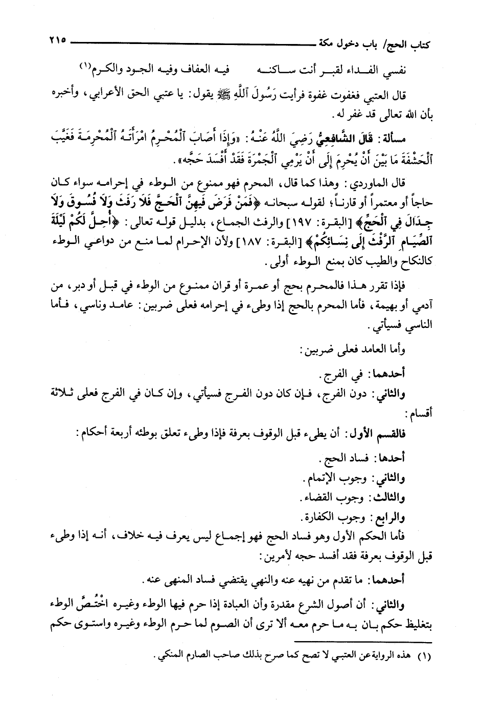 فَإِذَا تَقَرَّرَ هَذَا فَالْمُحْرِمُ بِحَجٍّ أَوْ عُمْرَةٍ أَوْ قِرَانٍ مَمْنُوعٌ مِنَ الْوَطْءِ فِي قُبُلٍ أَوْ دُبُرٍ، مِنْ آدَمِيٍّ أَوْ بَهِيمَةٍ، فَأَمَّا الْمُحْرِمُ بِالْحَجِّ إِذَا وَطِئَ فِي إِحْرَامِهِ فَعَلَى ضَرْبَيْنِ: عَامِدٌ وَنَاسِي، فَأَمَّا النَّاسِي فَسَيَأْتِي.