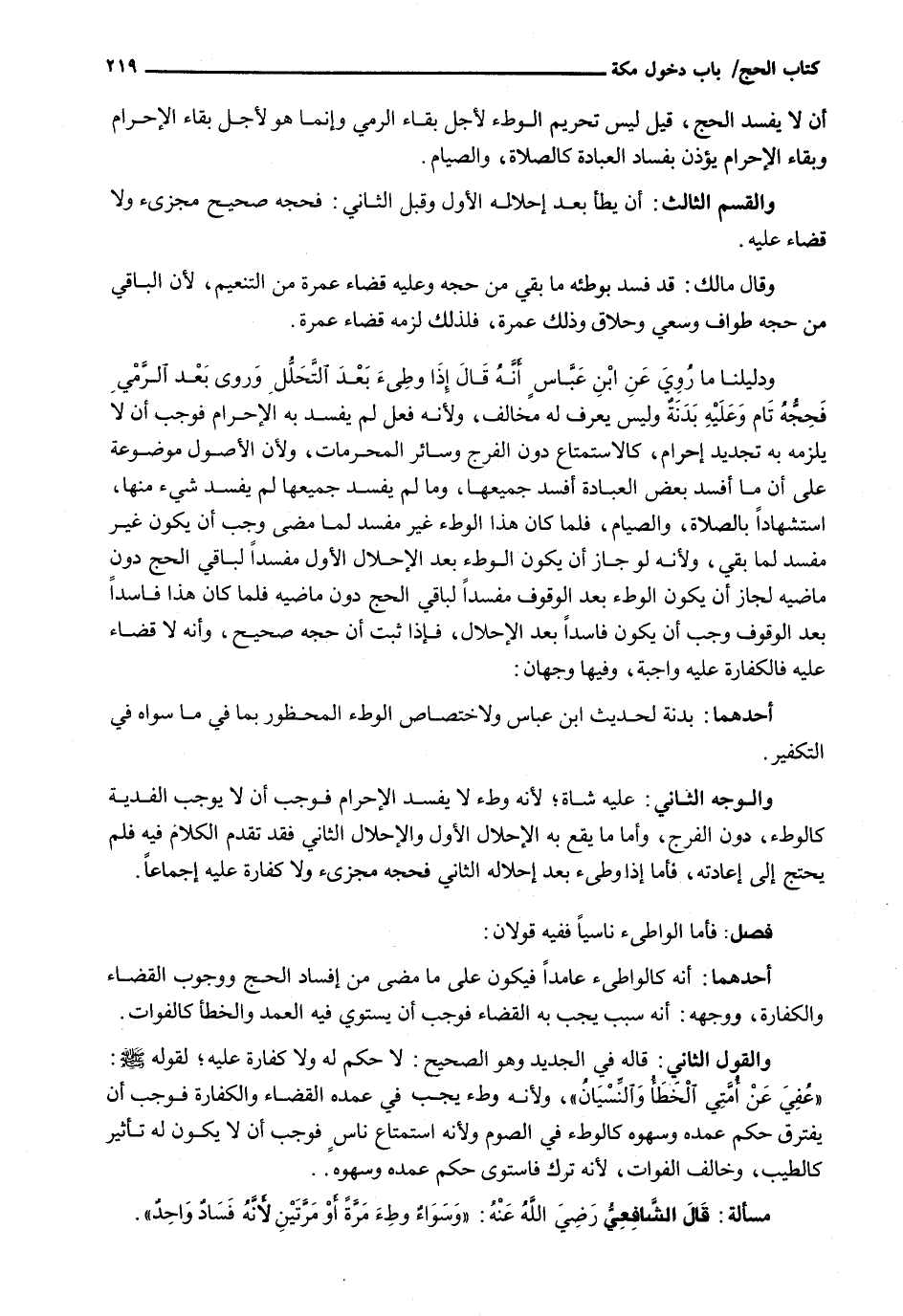 وَالْوَجْهُ الثَّانِي: عَلَيْهِ شَاةٌ؛ لِأَنَّهُ وَطْءٌ لَا يُفْسِدُ الْإِحْرَامَ فَوَجَبَ أَنْ لَا يُوجِبَ الْفِدْيَةَ كَالْوَطْءِ، دُونَ الْفَرْجِ، وَأَمَّا مَا يَقَعُ بِهِ الْإِحْلَالُ الْأَوَّلُ وَالْإِحْلَالُ الثَّانِي فَقَدْ تَقَدَّمَ الْكَلَامُ فِيهِ فَلَمْ يُحْتَجْ إِلَى إِعَادَتِهِ، فَأَمَّا إِذَا وَطِئَ بَعْدَ إِحْلَالِهِ الثَّانِي فَحَجُّهُ مُجْزِئٌ وَلَا كَفَّارَةَ عَلَيْهِ إِجْمَاعًا.
