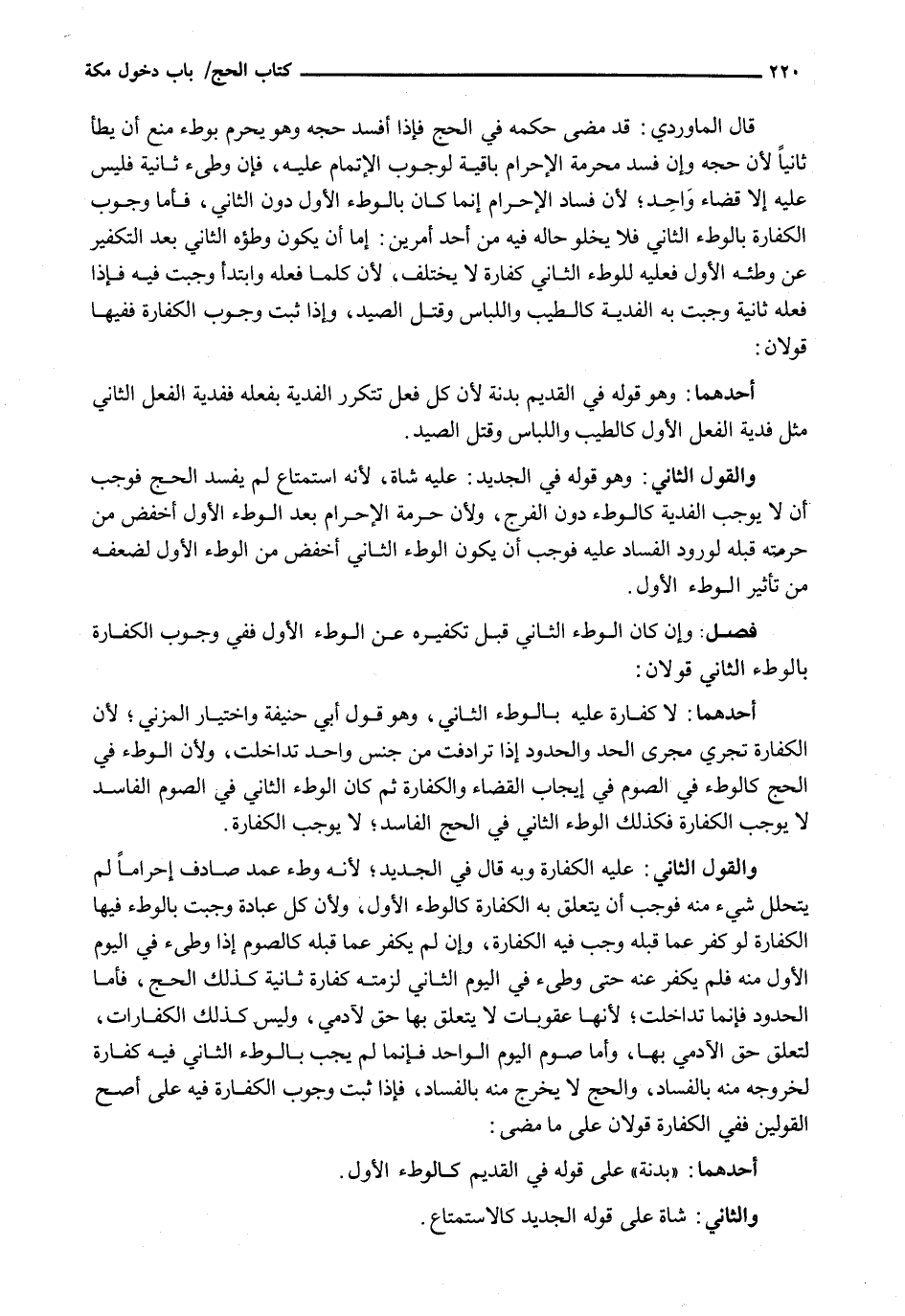 وَالْقَوْلُ الثَّانِي: عَلَيْهِ الْكَفَّارَةُ وَبِهِ قَالَ فِي الْجَدِيدِ؛ لِأَنَّهُ وَطْءُ عُمَدٍ صَادَفَ إِحْرَامًا لَمْ يَتَحَلَّلْ شَيْءٌ مِنْهُ فَوَجَبَ أَنْ يَتَعَلَّقَ بِهِ الْكَفَّارَةُ كَالْوَطْءِ الْأَوَّلِ، وَلِأَنَّ كُلَّ عِبَادَةٍ وَجَبَتْ بِالْوَطْءِ فِيهَا الْكَفَّارَةُ لَوْ كَفَّرَ عَمَّا قَبْلَهُ وَجَبَ فِيهِ الْكَفَّارَةُ، وَإِنْ لَمْ يُكَفِّرْ عَمَّا قَبْلَهُ كَالصَّوْمِ إِذَا وَطِئَ فِي الْيَوْمِ الْأَوَّلِ مِنْهُ فَلَمْ يُكَفِّرْ عَنْهُ حَتَّى وَطِئَ فِي الْيَوْمِ الثَّانِي لَزِمَتْهُ كَفَارَّةٌ ثَانِيَةٌ كَذَلِكَ الْحَجُّ، فَأَمَّا الْحُدُودُ فَإِنَّمَا تَدَاخَلَتْ؛ لِأَنَّهَا عُقُوبَاتٌ لَا يَتَعَلَّقُ بِهَا حَقٌّ لِآدَمِيٍّ، وَلَيْسَ كَذَلِكَ الْكَفَّارَاتُ، لِتَعَلُّقِ حَقِّ الْآدَمِيِّ بِهَا، وَأَمَّا صَوْمُ الْيَوْمِ الْوَاحِدِ فَإِنَّمَا لَمْ يَجِبْ بِالْوَطْءِ الثَّانِي فِيهِ كَفَّارَةٌ لِخُرُوجِهِ مِنْهُ بِالْفَسَادِ، وَالْحَجُّ لَا يَخْرُجُ مِنْهُ بِالْفَسَادِ، فَإِذَا ثَبَتَ وُجُوبُ الْكَفَّارَةِ فِيهِ عَلَى أَصَحِّ الْقَوْلَيْنِ فَفِي الْكَفَّارَةِ قَوْلَانِ عَلَى مَا مَضَى: