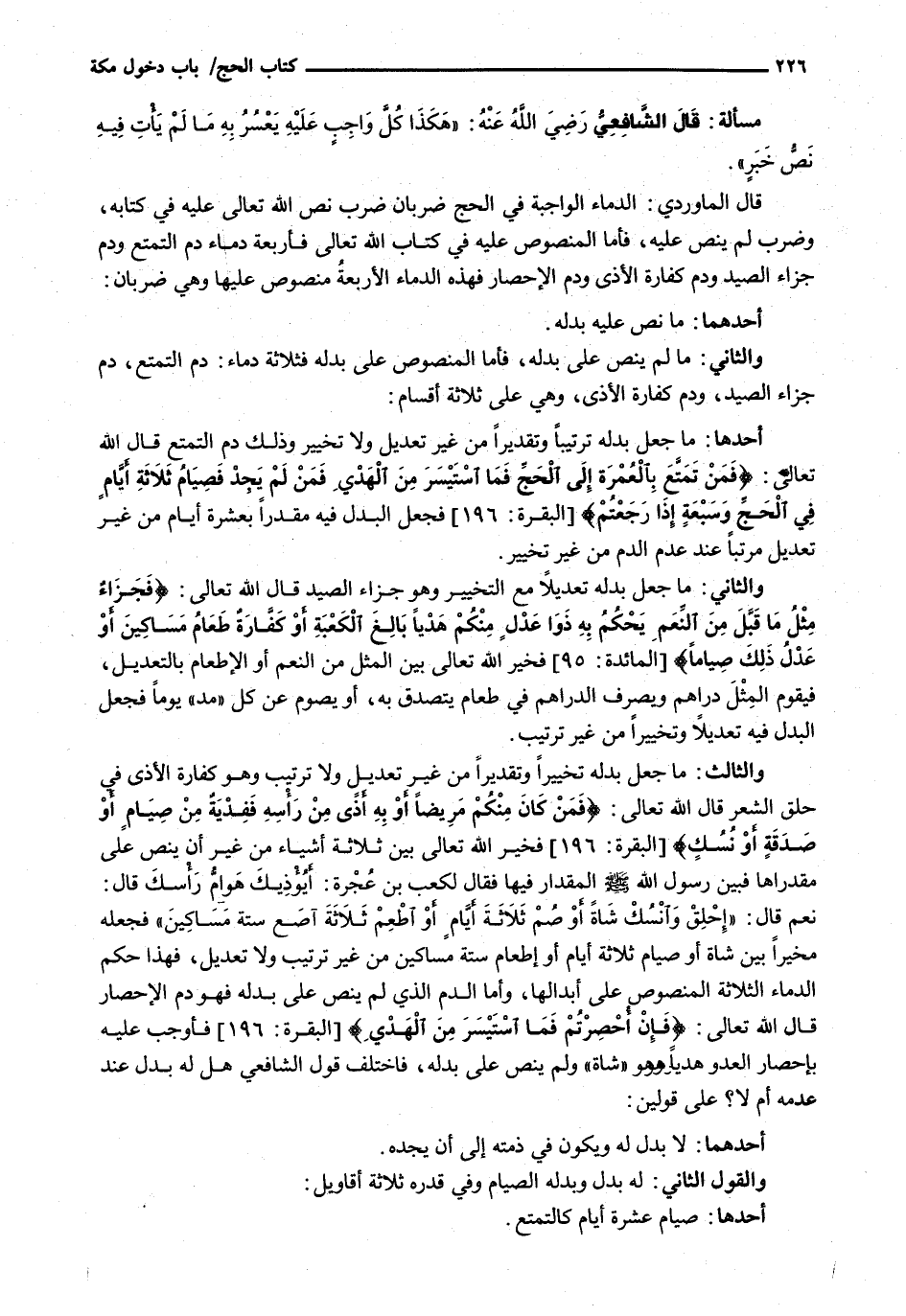 وَالثَّالِثُ: مَا جَعَلَ بَدَلَهُ تَخْيِيرًا وَتَقْدِيرًا مِنْ غَيْرِ تَعْدِيلٍ وَلَا تَرْتِيبٍ وَهُوَ كَفَّارَةُ الْأَذَى فِي حَلْقِ الشَّعْرِ قَالَ اللَّهُ تَعَالَى: {فَمَنْ كَانَ مِنْكُمْ مَرِيضاً أَوْ بِهِ أَذًى مِنْ رأْسِهِ فَفِدْيَةٌ مِنْ صِيَامٍ أوْ صَدَقَةٍ أوْ نُسُكٍ) {البقرة: 196) فَخَيَّرَ اللَّهُ تَعَالَى بَيْنَ ثَلَاثَةِ أَشْيَاءَ مِنْ غير أن ينص على مقدراها فَبَيَّنَ رَسُولُ اللَّهِ - صَلَّى اللَّهُ عَلَيْهِ وَسَلَّم َ - الْمِقْدَارَ فِيهَا فَقَالَ لِكَعْبِ بْنِ عُجْرَةَ: أَيُؤْذِيكَ هَوَامُّ رَأْسِكَ قَالَ: نَعَمْ قَالَ: " احْلِقْ وَانْسُكْ شَاةً أَوْ صُمْ ثَلَاثَةَ أيامٍ أَوْ أَطْعِمْ ثَلَاثَةَ آصُعٍ سِتَّةَ مَسَاكِينَ " فَجَعَلَهُ مُخَيَّرًا بَيْنَ شاة أو صيام أو ثَلَاثَةِ أَيَّامٍ أَوْ إِطْعَامِ سِتَّةِ مَسَاكِينَ مِنْ غَيْرِ تَرْتِيبٍ وَلَا تَعْدِيلٍ، فَهَذَا حُكْمُ الدِّمَاءِ الثَّلَاثَةِ الْمَنْصُوصِ عَلَى أَبْدَالِهَا، وَأَمَّا الدَّمُ الَّذِي لَمْ يَنُصَّ عَلَى بَدَلِهِ فَهُوَ دَمُ الْإِحْصَارِ قال الله تعالى: {فَإِذا أُحْصِرْتُمْ فَمَا اسْتَيْسَرَ مِنْ الهَدْيِ) {البقرة: 196) فَأَوْجَبَ عَلَيْهِ بِإِحْصَارِ الْعَدُوِّ هَدْيًا وَهُوَ " شَاةٌ " وَلَمْ يَنُصَّ عَلَى بَدَلِهِ، فَاخْتَلَفَ قَوْلُ الشَّافِعِيِّ هَلْ لَهُ بَدَلٌ عِنْدَ عَدَمِهِ أَمْ لَا؟ عَلَى قَوْلَيْنِ: