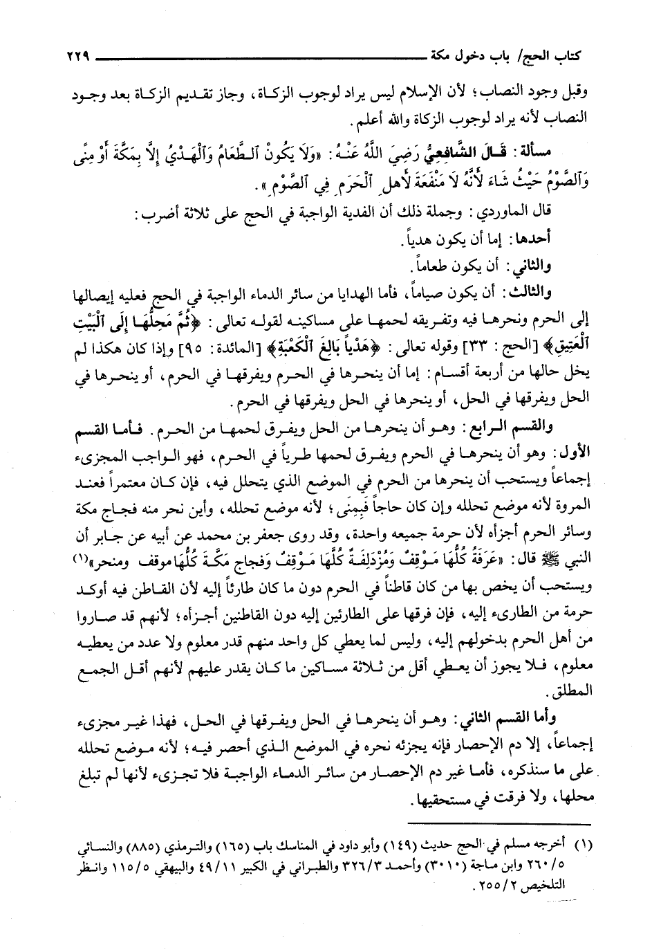 وَالثَّالِثُ: أَنْ يَكُونَ صِيَامًا، فَأَمَّا الْهَدَايَا مِنْ سَائِرِ الدِّمَاءِ الْوَاجِبَةِ فِي الْحَجِّ فَعَلَيْهِ إِيصَالُهَا إِلَى الْحَرَمِ وَنَحْرُهَا فِيهِ وَتَفْرِيقُهُ لَحْمَهَا عَلَى مَسَاكِينِهِ لِقَوْلِهِ تَعَالَى: {ثُمَّ مَحِلُّهَا إِلَى الْبَيْتِ الْعَتِيقِ) {الحج: 33) وقَوْله تَعَالَى: {هَدْياً بَالِغَ الكَعْبَةِ) {المائدة: 95) وَإِذَا كَانَ هَكَذَا لَمْ يَخْلُ حَالُهَا مِنْ أَرْبَعَةِ أَقْسَامٍ: إِمَّا أَنْ يَنْحَرَهَا فِي الْحَرَمِ وَيُفَرِّقَهَا فِي الْحَرَمِ، أَوْ يَنْحَرَهَا فِي الْحِلِّ وَيُفَرِّقَهَا فِي الْحِلِّ، أَوْ يَنْحَرَهَا فِي الحل ويفرقها في الحرم.