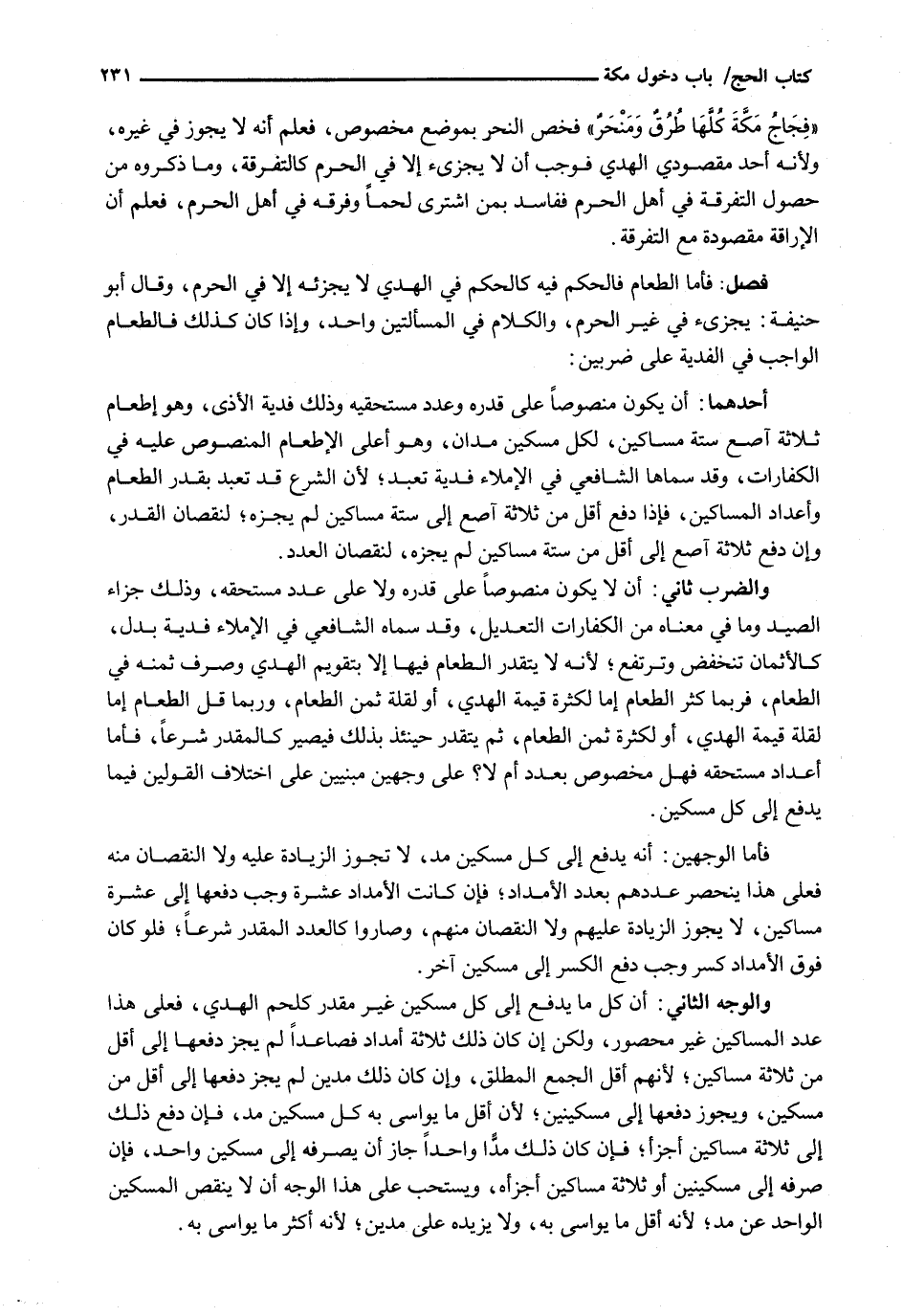 فأما الْوَجْهَيْنِ: أَنَّهُ يُدْفَعُ إِلَى كُلِّ مِسْكِينٍ مُدٌّ، لَا تَجُوزُ الزِّيَادَةُ عَلَيْهِ وَلَا النُّقْصَانُ مِنْهُ فَعَلَى هَذَا يَنْحَصِرُ عَدَدُهُمْ بِعَدَدِ الْأَمْدَادِ؛ فَإِنْ كَانَتِ الْأَمْدَادُ عَشَرَةً وَجَبَ دَفْعُهَا إِلَى عَشَرَةِ مَسَاكِينَ، لَا يَجُوزُ الزِّيَادَةُ عَلَيْهِمْ وَلَا النُّقْصَانُ مِنْهُمْ، وَصَارُوا كَالْعَدَدِ الْمُقَدَّرِ شَرْعًا؛ فَلَوْ كَانَ فَوْقَ الْأَمْدَادِ كَسْرٌ وَجَبَ دَفْعُ الْكَسْرِ إِلَى مِسْكِينٍ آخَرَ.