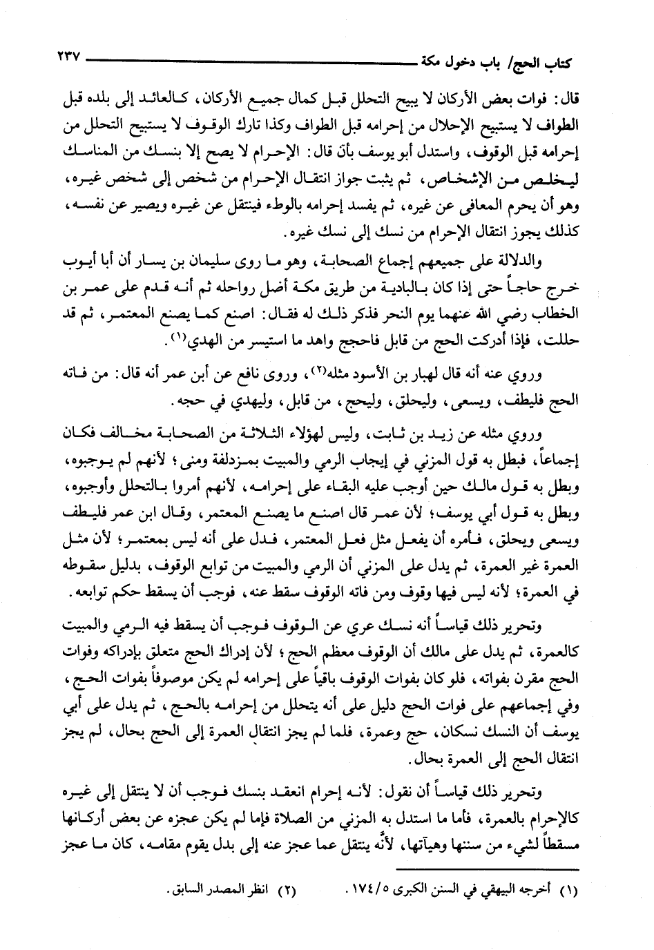 قَالَ: فَوَاتُ بَعْضِ الْأَرْكَانِ لَا يُبِيحُ التَّحَلُّلَ قَبْلَ كَمَالِ جَمِيعِ الْأَرْكَانِ، كَالْعَائِدِ إِلَى بَلَدِهِ قَبْلَ الطَّوَافِ لَا يَسْتَبِيحُ الْإِحْلَالَ مِنْ إِحْرَامِهِ قَبْلَ الطَّوَافِ وَكَذَا تَارِكُ الْوُقُوفِ لَا يَسْتَبِيحُ التَّحَلُّلَ مِنْ إِحْرَامِهِ قَبْلَ الْوُقُوفِ، وَاسْتَدَلَّ أبو يوسف بِأَنْ قَالَ الْإِحْرَامُ لَا يَصِحُّ إِلَّا بِنُسُكٍ مِنَ الْمَنَاسِكِ لِيَخَلُصَ مِنَ الْأَشْخَاصِ، ثُمَّ يثبت جَوَازَ انْتِقَالِ الْإِحْرَامِ مِنْ شَخْصٍ إِلَى شَخْصٍ غَيْرِهِ، وَهُوَ أَنْ يُحْرِمَ الْمُعَافَى عَنْ غَيْرِهِ، ثُمَّ يُفْسِدُ إِحْرَامَهُ بِالْوَطْءِ فَيَنْتَقِلُ عَنْ غَيْرِهِ وَيَصِيرُ عَنْ نَفْسِهِ، كَذَلِكَ يَجُوزُ انْتِقَالُ الْإِحْرَامِ مَنْ نَسُكٍ إِلَى نُسُكٍ غَيْرِهِ.