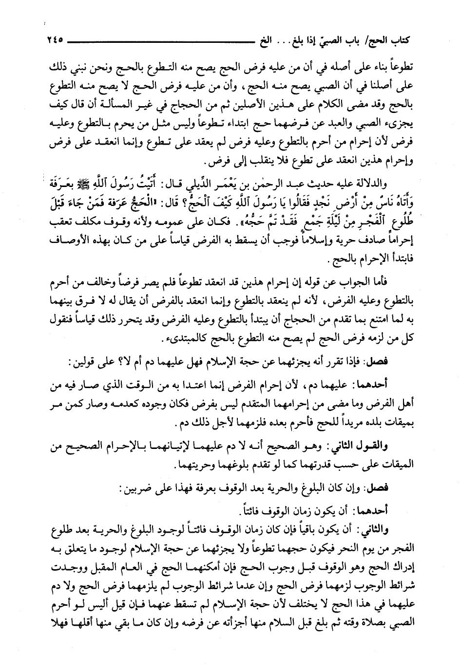 : وَإِنْ كَانَ الْبُلُوغُ وَالْحَرِيَّةُ بَعْدَ الْوُقُوفِ بِعَرَفَةَ فَهَذَا عَلَى ضَرْبَيْنِ: