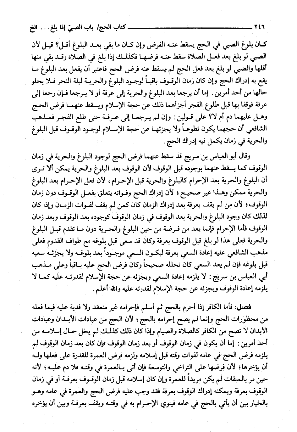 كَانَ بُلُوغُ الصَّبِيِّ فِي الْحَجِّ يُسْقِطُ عَنْهُ الْفَرْضَ وَإِنْ كَانَ مَا بَقِيَ بَعْدَ الْبُلُوغِ أَقَلَّ؟ قِيلَ لِأَنَّ الصَّبِيَّ لَوْ بَلَغَ بَعْدَ فِعْلِ الصَّلَاةِ سَقَطَ عَنْهُ فَرْضُهَا فَكَذَلِكَ إِذَا بَلَغَ فِي الصَّلَاةِ وَقَدْ بَقِيَ مِنْهَا أَقَلُّهَا وَالصَّبِيُّ لَوْ بَلَغَ بَعْدَ فِعْلِ الْحَجِّ لَمْ يَسْقُطْ عَنْهُ فَرْضُ الْحَجِّ فَاعْتَبَرَ أَنْ يَفْعَلَ بَعْدَ الْبُلُوغِ مَا يَقَعُ بِهِ إِدْرَاكُ الْحَجِّ وَإِنْ كَانَ زَمَانُ الْوُقُوفِ بَاقِيًا لِوُجُودِ الْبُلُوغِ وَالْحُرِّيَّةِ لَيْلَةَ النَّحْرِ فَلَا يَخْلُو حَالُهَا مِنْ أَحَدِ أَمْرَيْنِ. إِمَّا أَنْ يَرْجِعَا بَعْدَ الْبُلُوغِ وَالْحُرِّيَّةِ إِلَى عَرَفَةَ أَوْ لَا يَرْجِعَا فَإِنْ رَجِعَا إِلَى عَرَفَةَ فَوَقَفَا بِهَا قَبْلَ طُلُوعِ الْفَجْرِ أَجْزَأَهُمَا ذَلِكَ عَنْ حَجَّةِ الْإِسْلَامِ وَيَسْقُطُ عَنْهُمَا فَرْضُ الْحَجِّ وَهَلْ عَلَيْهِمَا دَمٌ أَمْ لَا؟ عَلَى قَوْلَيْنِ: وَإِنْ لَمْ يَرْجِعَا إِلَى عَرَفَةَ حَتَّى طَلَعَ الْفَجْرُ فَمَذْهَبُ الشَّافِعِيِّ أَنَّ حَجَّهُمَا يَكُونُ تُطَوُّعًا وَلَا يُجْزِئُهَا عَنْ حَجَّةِ الْإِسْلَامِ لِوُجُودِ الْوُقُوفِ قَبْلَ الْبُلُوغِ وَالْحُرِّيَّةِ فِي زَمَانٍ يَكْمُلُ فِيهِ إِدْرَاكُ الْحَجِّ.